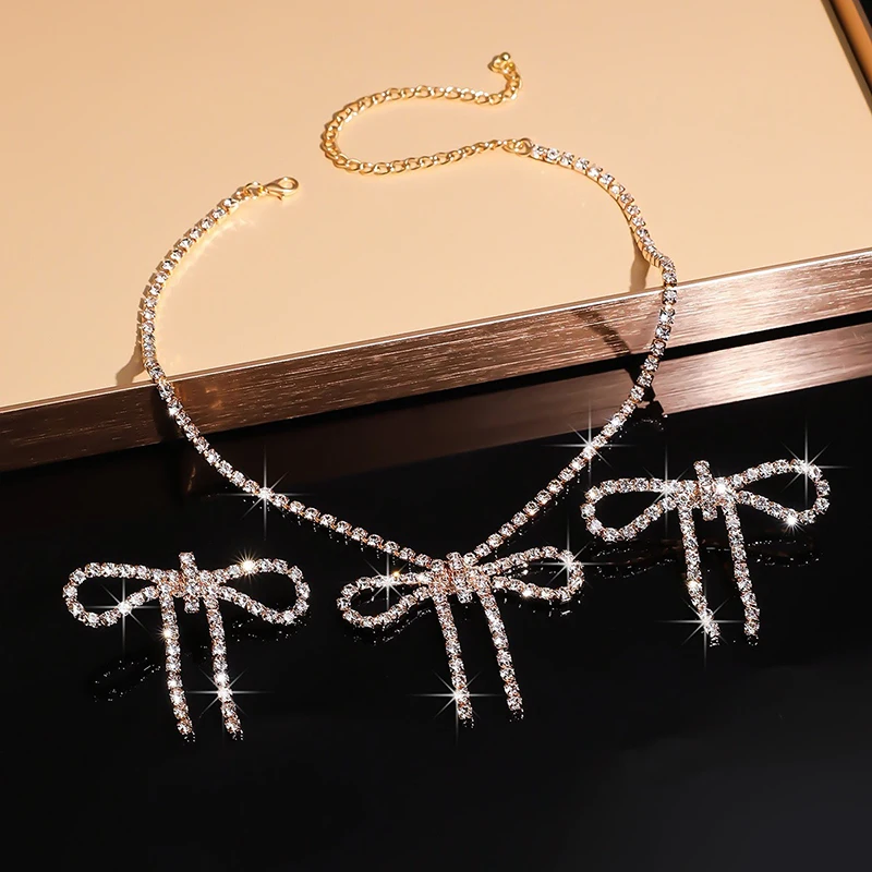 1 ensemble élégant brillant arc boucles d'oreilles collier ensemble pour femmes filles Vintage mode collier boucles d'oreilles bijoux accessoires cadeaux