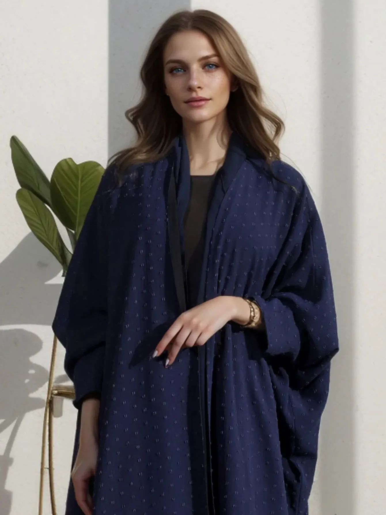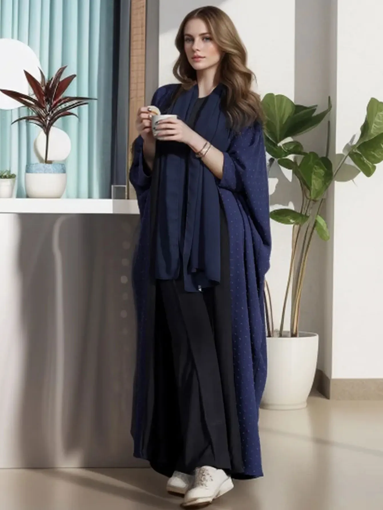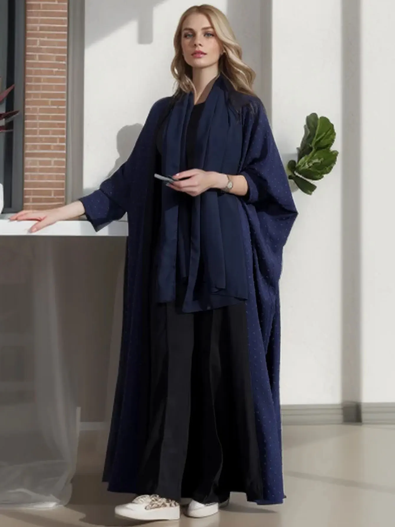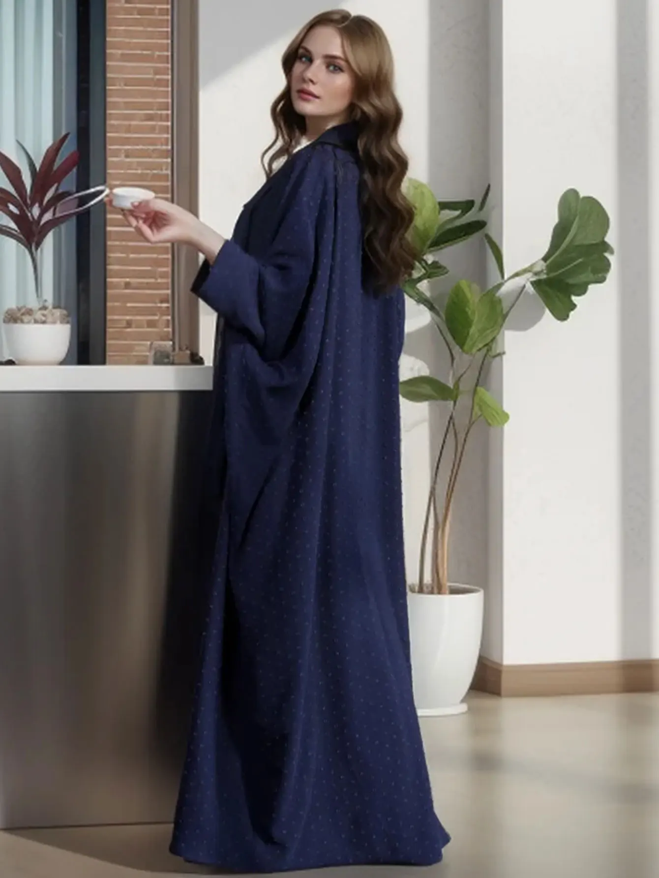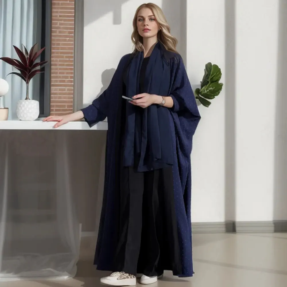 2025 Abaya musulman décontracté et élégant de style saoudien bleu marine avec motif à pois subtil, idéal pour un usage quotidien dans les villes du moyen-orient |
