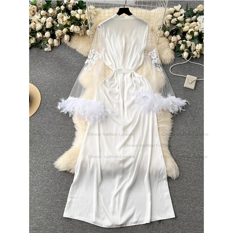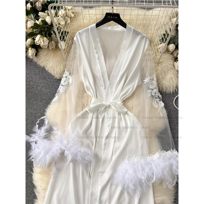 2025 nouvelle plume garniture maille panneau Satin Robe mariée Robe De soirée De mariage femmes Satin Lingerie Mariage Kimono longues robes De Novia |
