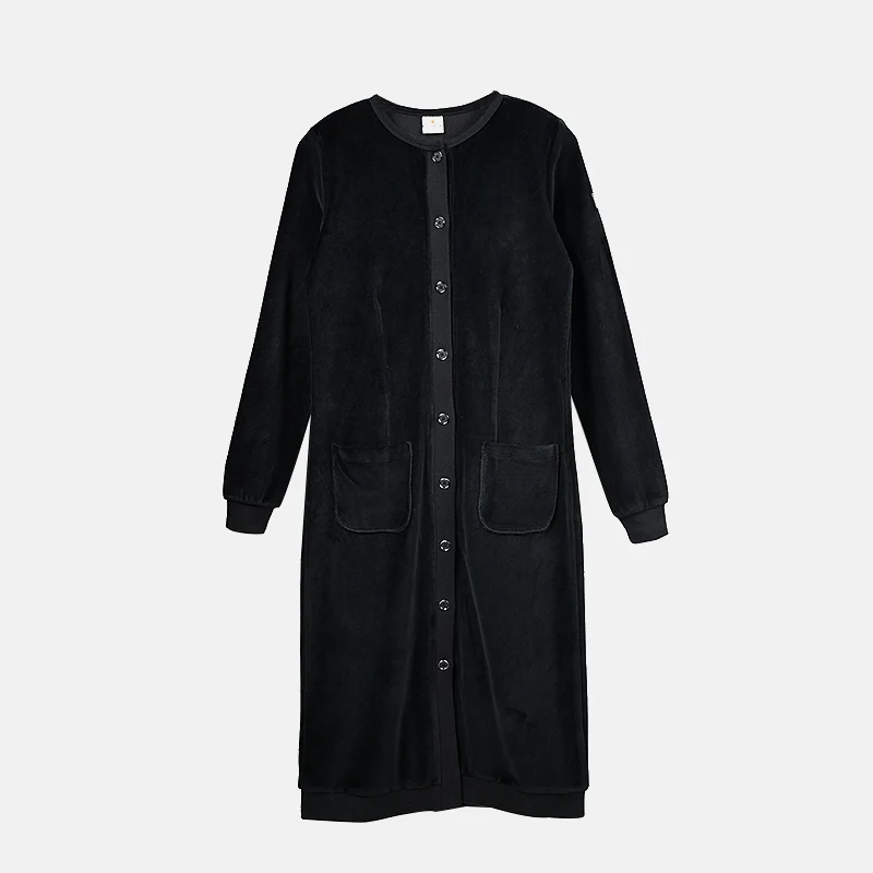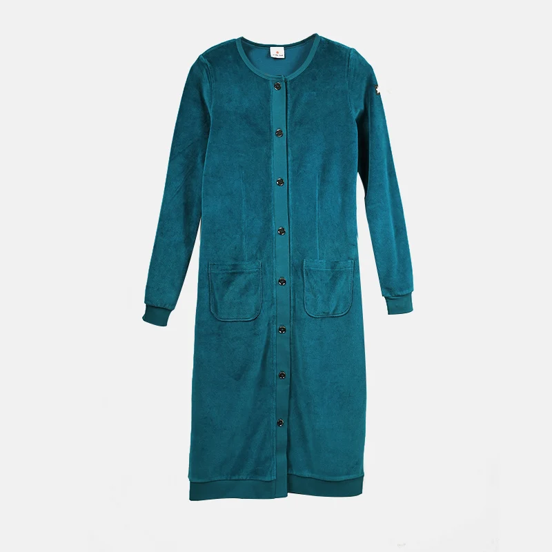 "J'ai été très agréablement surprise par la qualité de cette robe en velours. Elle est extrêmement douce et confortable à porter. Les boutons sur le devant et les deux poches pratiques sont des détails qui rendent cette pièce très fonctionnelle. Le seul petit bémol serait que la taille m'a semblé un peu juste, mais dans l'ensemble c'est un produit de très bonne facture que je recommande sans hésiter."