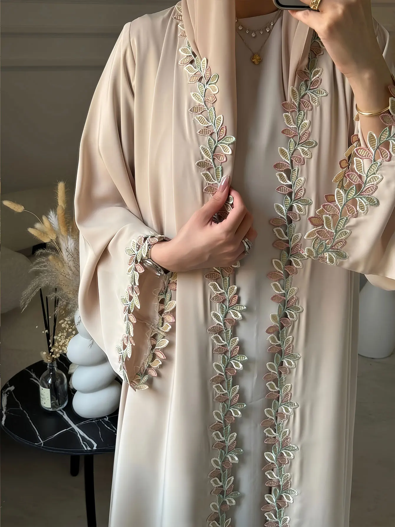 Abaya beige pour femme musulmane avec broderie de feuilles multicolores délicates Merging modestie et élégance pour les occasions quotidiennes et spéciales |