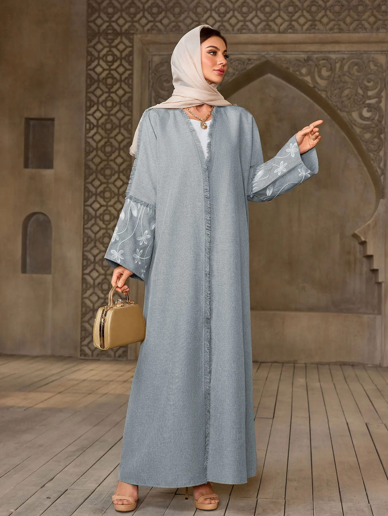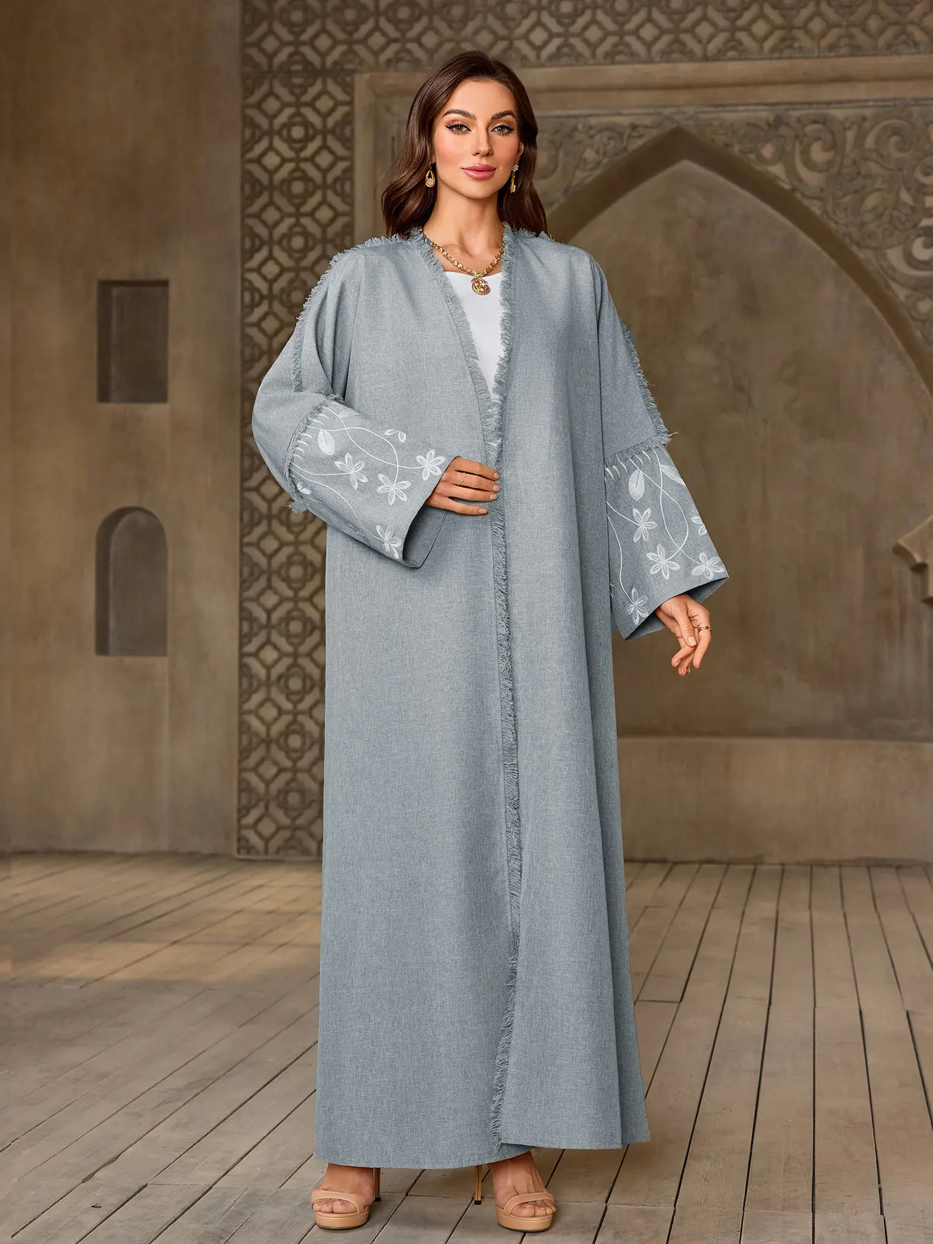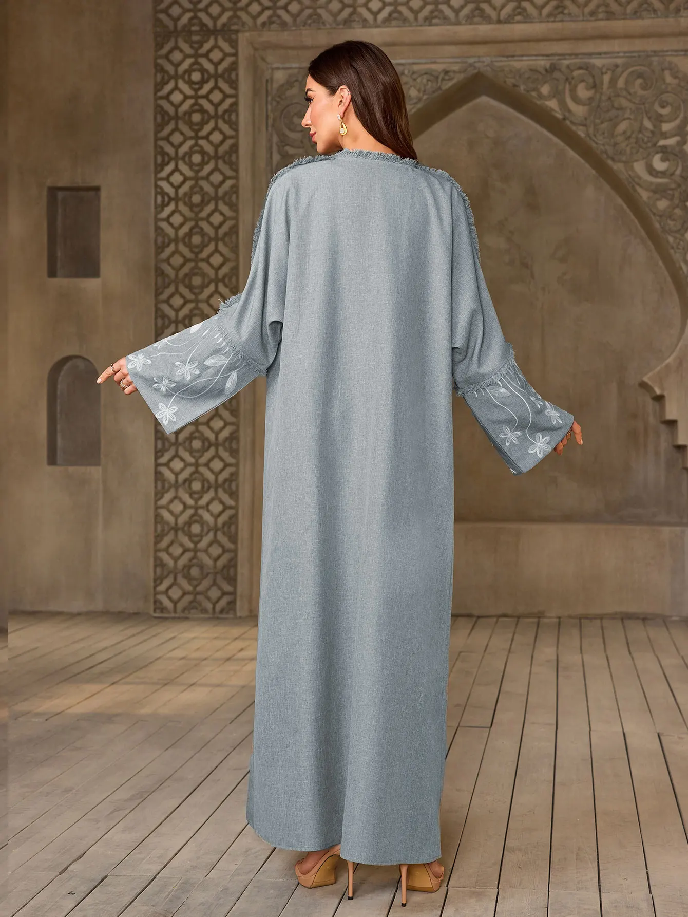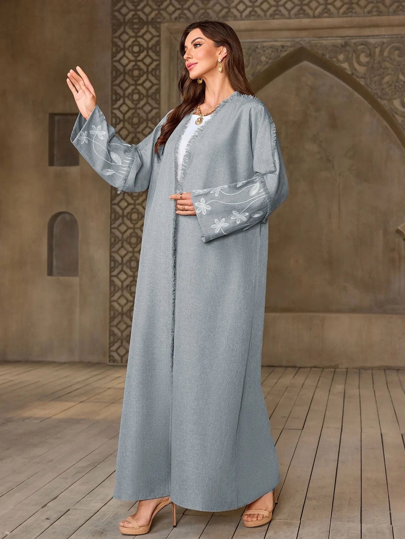 Abaya gris clair élégant pour dames islamiquesBroderie florale pour les célébrations du Ramadan à Dubaï, du koweït et du Moyen-Orient, usage quotidien