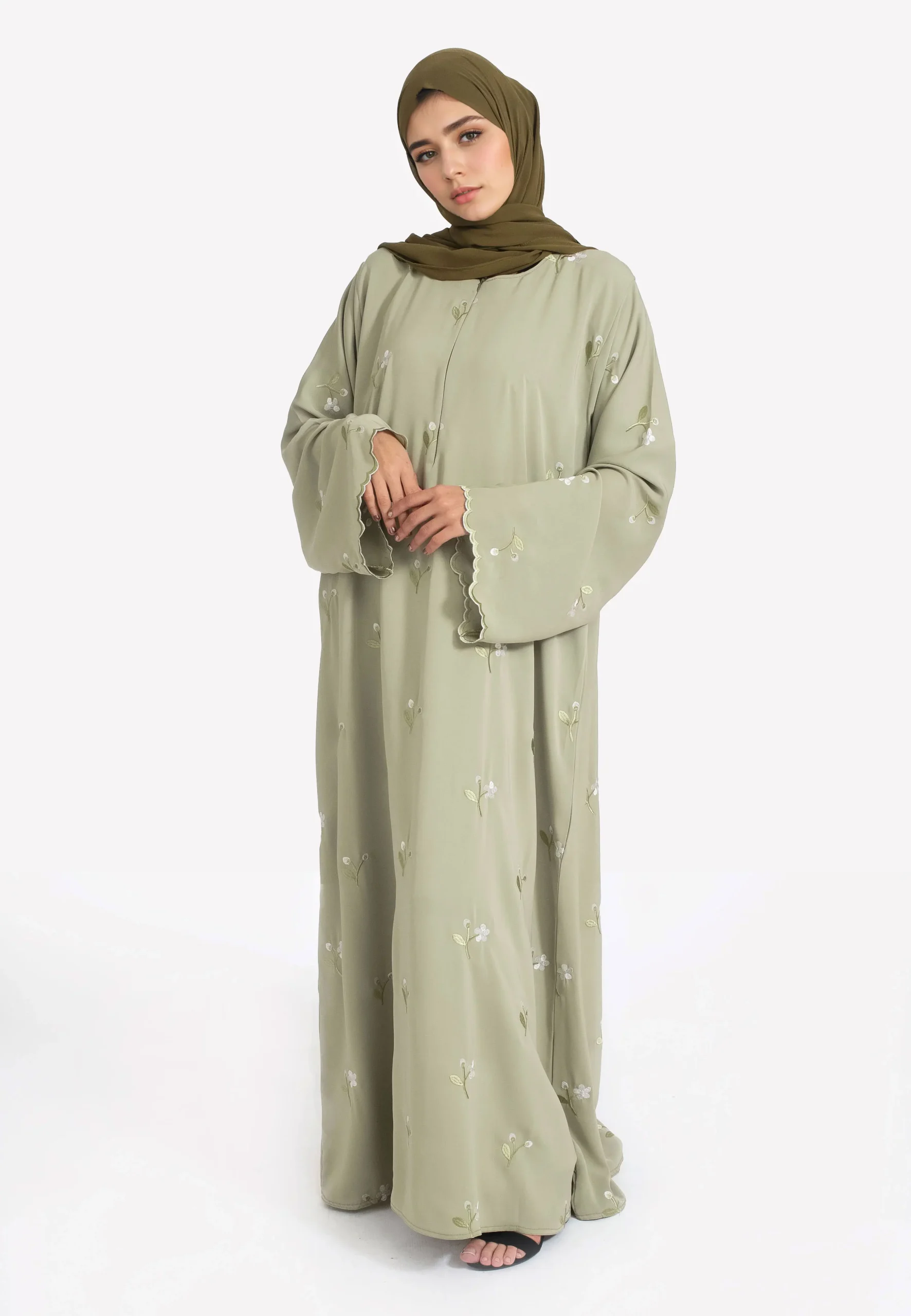 Abaya islamique musulman élégant pour femmes, broderie florale vert clair, poignets délicats, idéal pour les États-Unis, l'Arabie Saoudite, le Qatar |