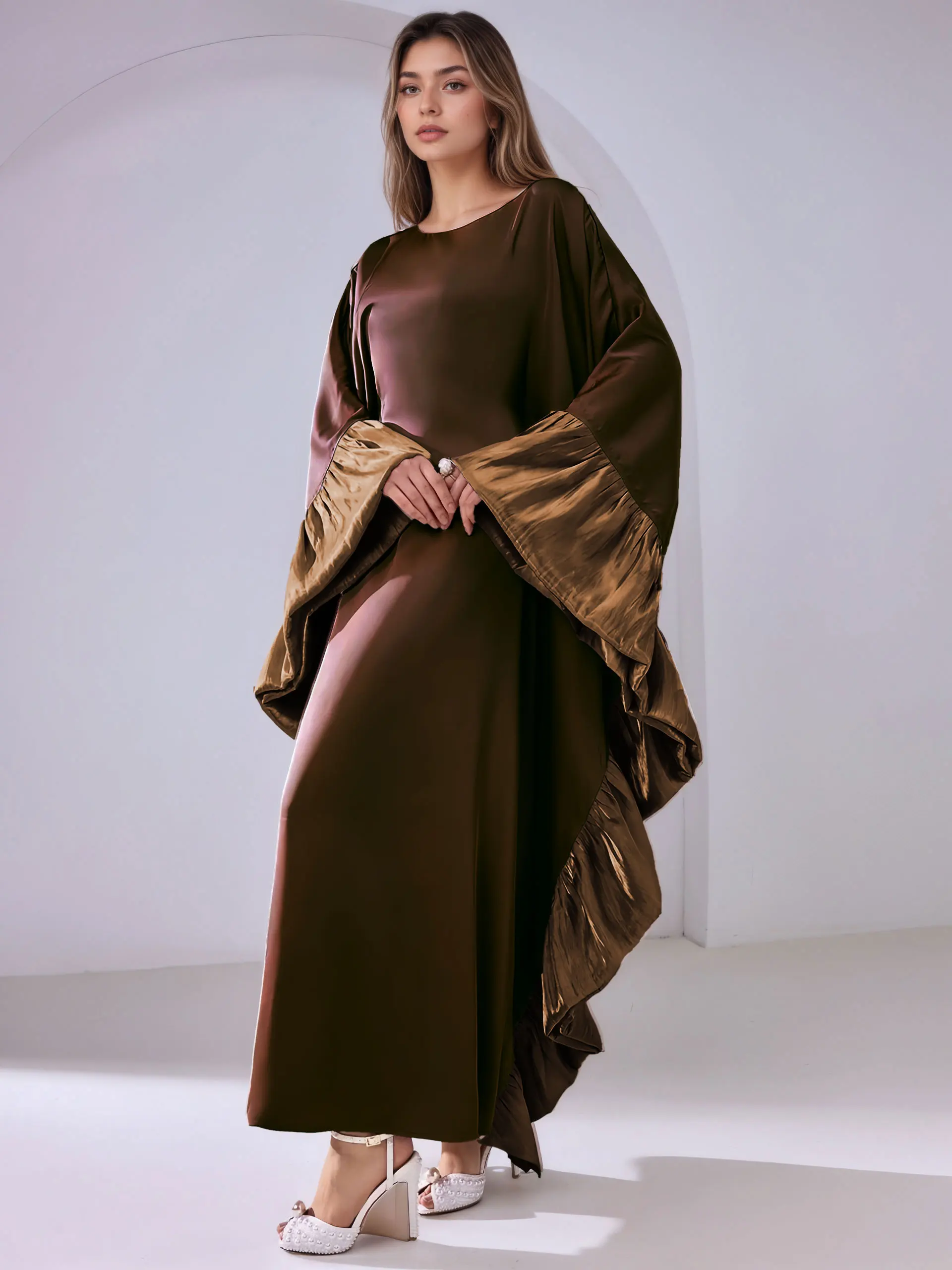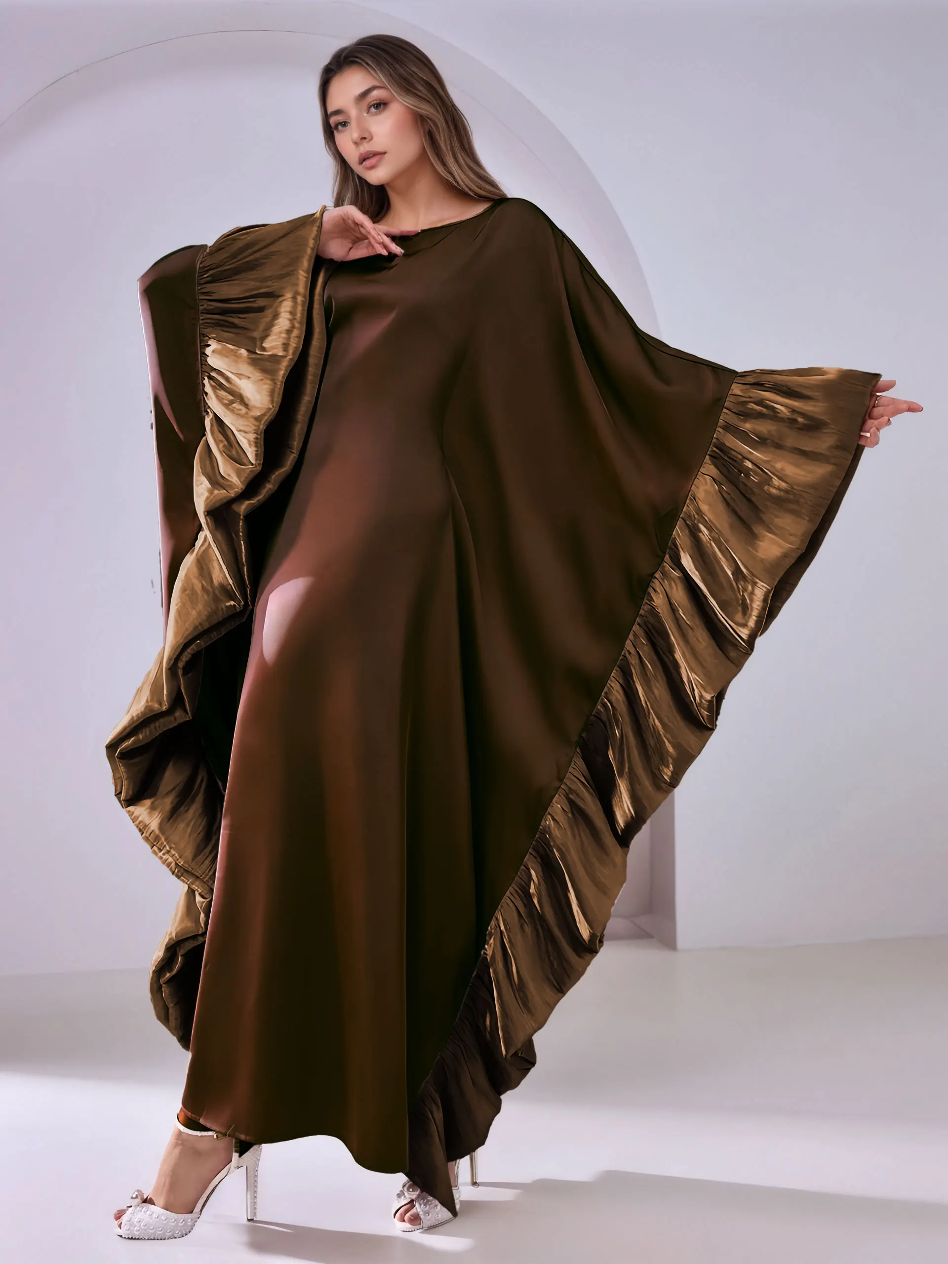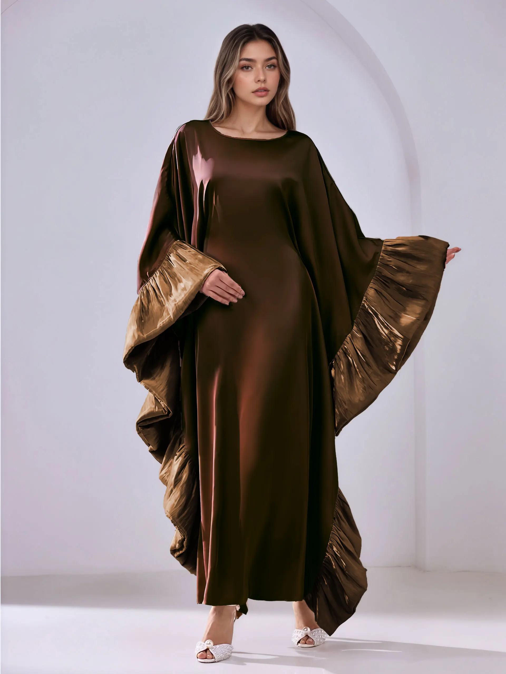 Abaya marron foncé pour femmes musulmanes, avec manches à volants brillantes, pour la mode modeste islamique, prières, mariages, événements religieux, nouvelle collection |