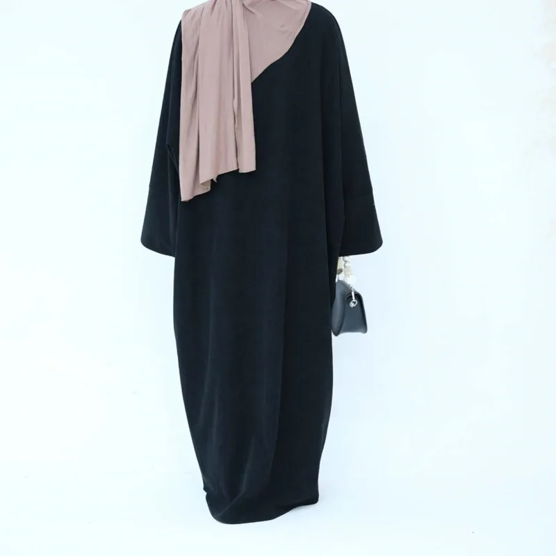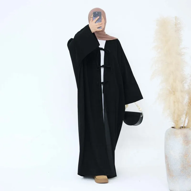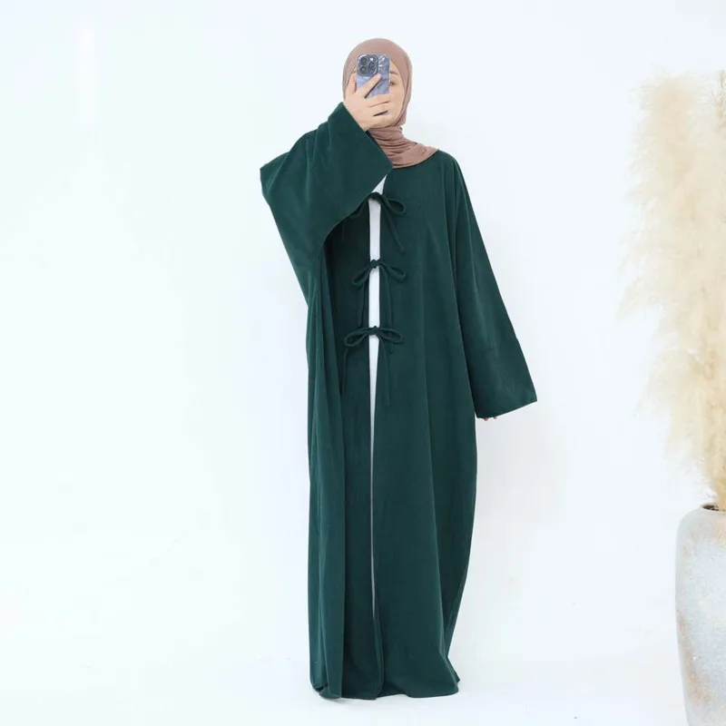 Abaya ouvert en velours côtelé d'hiver, Kimono de dubaï modeste avec poches, robe pour femme musulmane, Cardigan épais et chaud sur le devant avec nœuds |