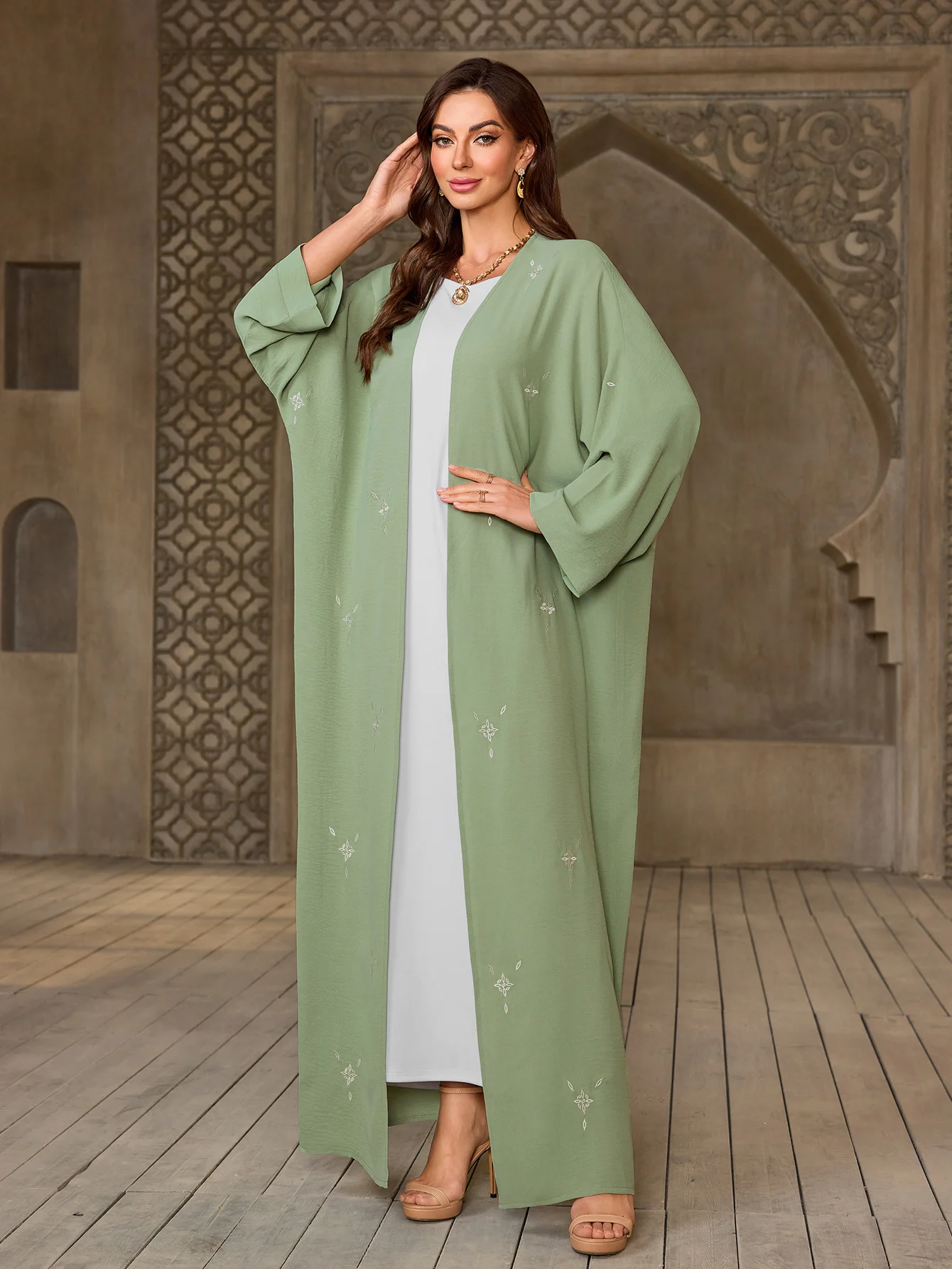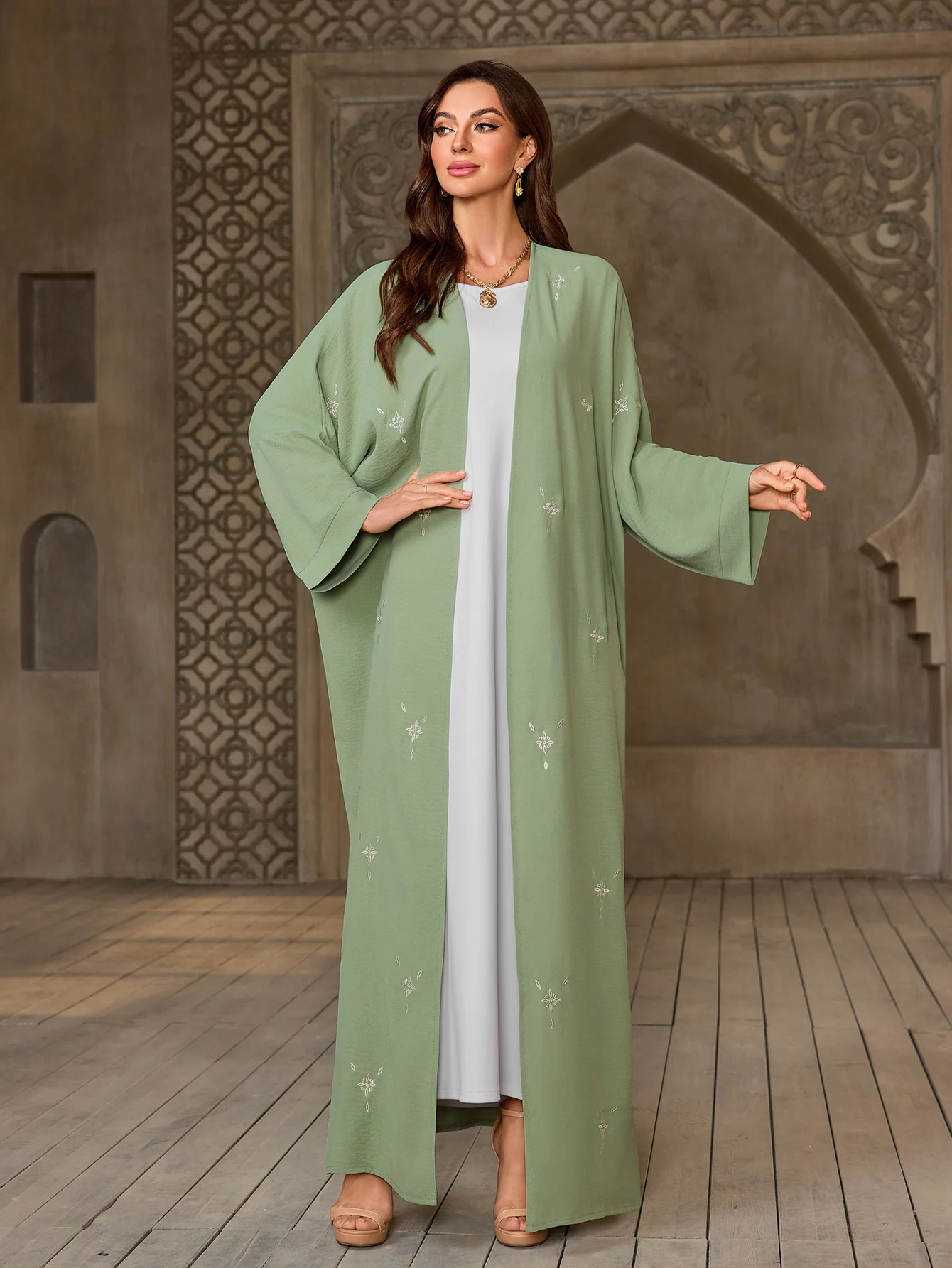 Abaya vert clair pour dames islamiques, détails de broderie blanche, idéal pour un usage quotidien au Qatar, du koweït et du Moyen-Orient