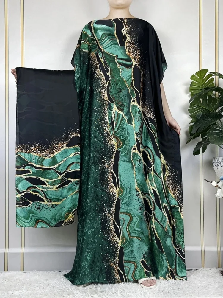 Abayas à imprimé musulman pour femmes, manches courtes, imitation injSatin, robe longue, robes islamiques avec hijabs, luxe doux |