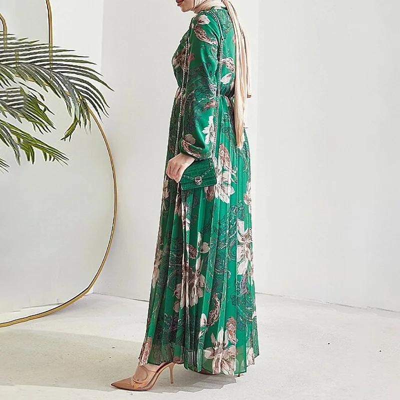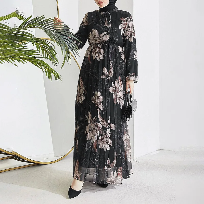 Abayas musulmanes pour femmes, en mousseline de soie, avec imprimé de fleurs plissées, col haut, robes longues de soirée dansante, robe élégante, nouvelle collection