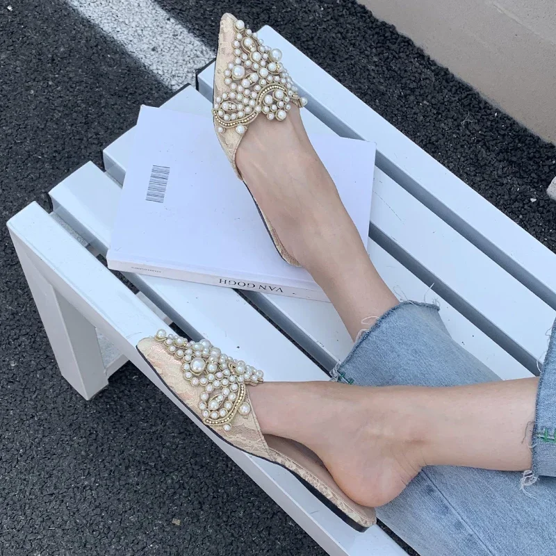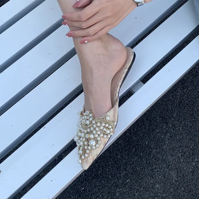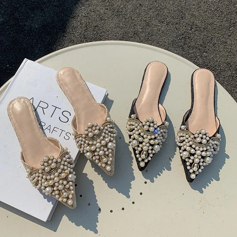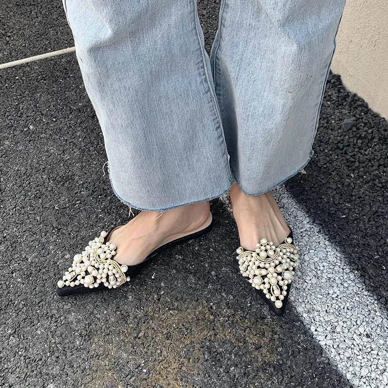 Aneikeh-Sandales à talons plats en maille pour femmes, pantoufles pointues, chaussures à enfiler noires, élégantes, sexy, légères, de luxe, de fête d'été |
