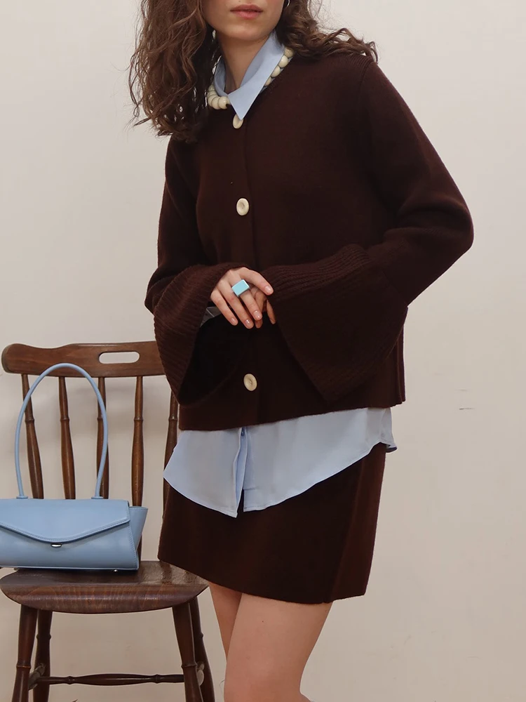 Aoaiiys Cardigan tricoté pour femmes pull automne hiver simple boutonnage manches évasées col rond manteaux Simple solide mode Cardigan |