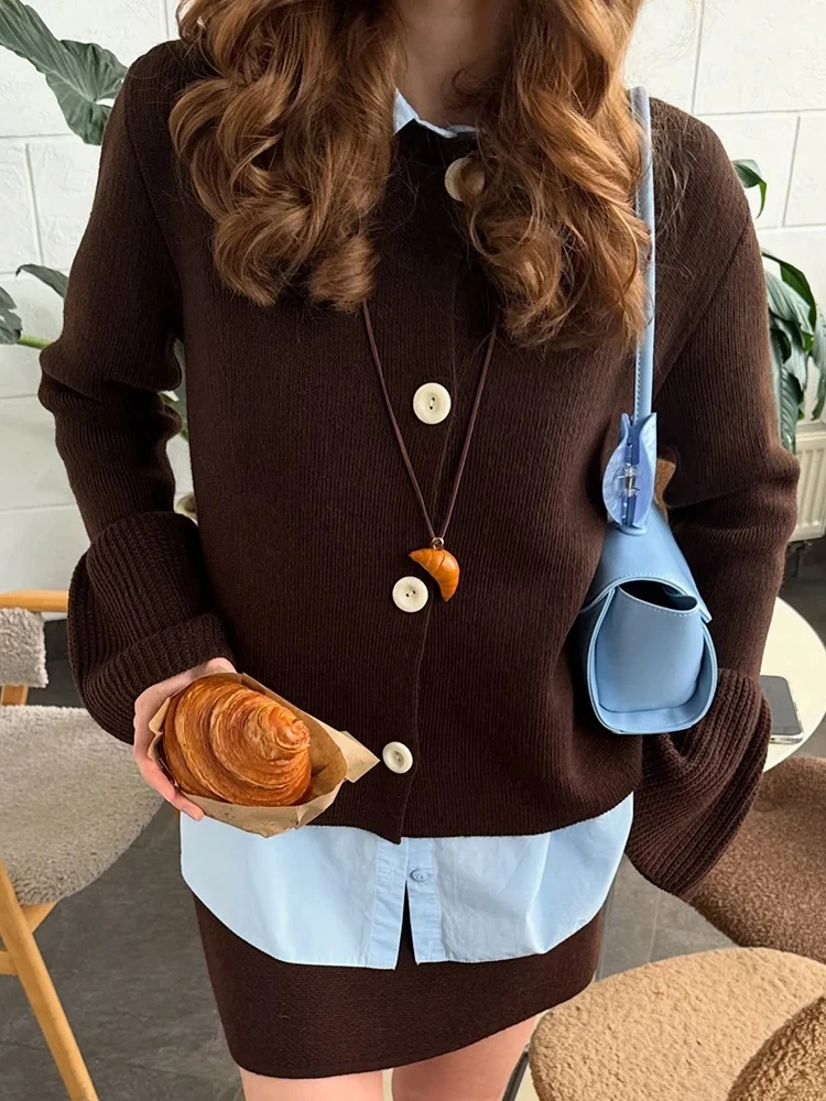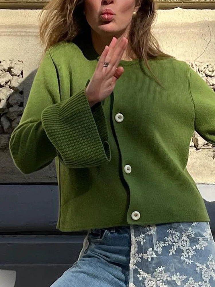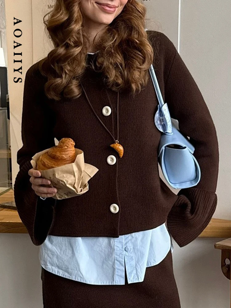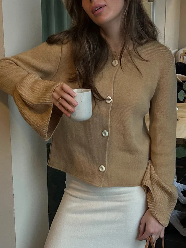 Aoaiiys Cardigan tricoté pour femmes pull automne hiver simple boutonnage manches évasées col rond manteaux Simple solide mode Cardigan