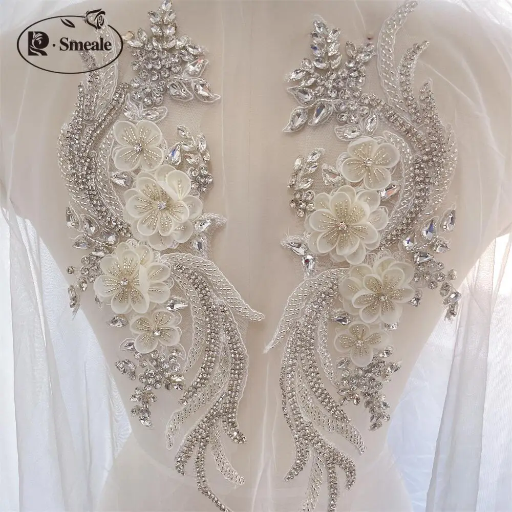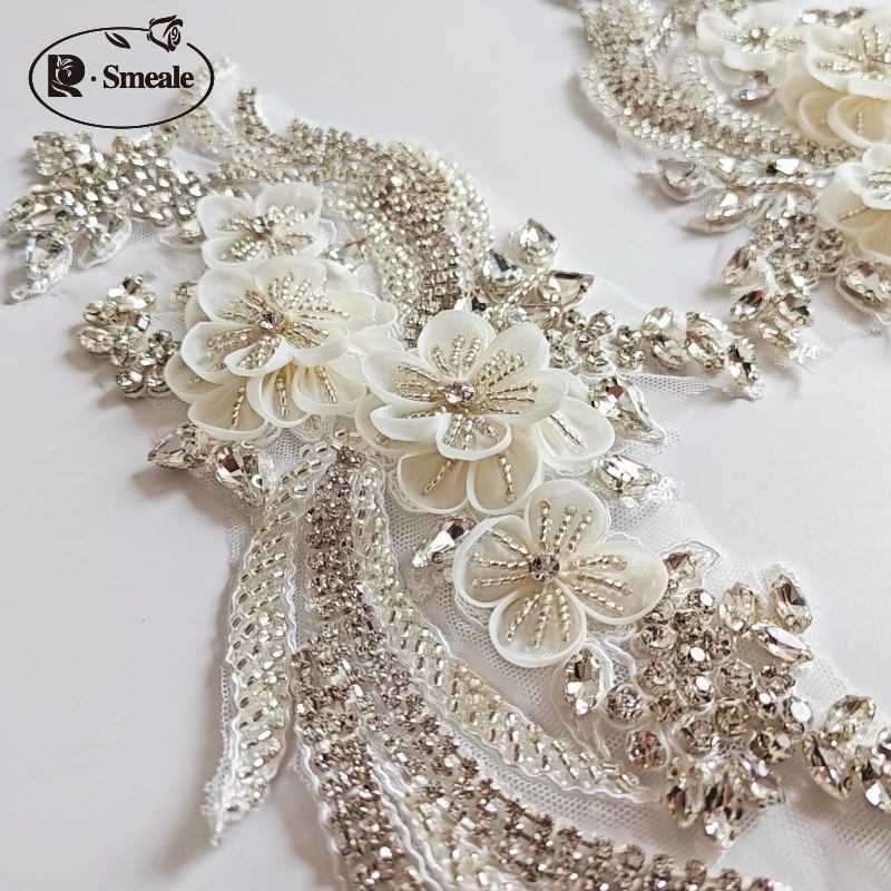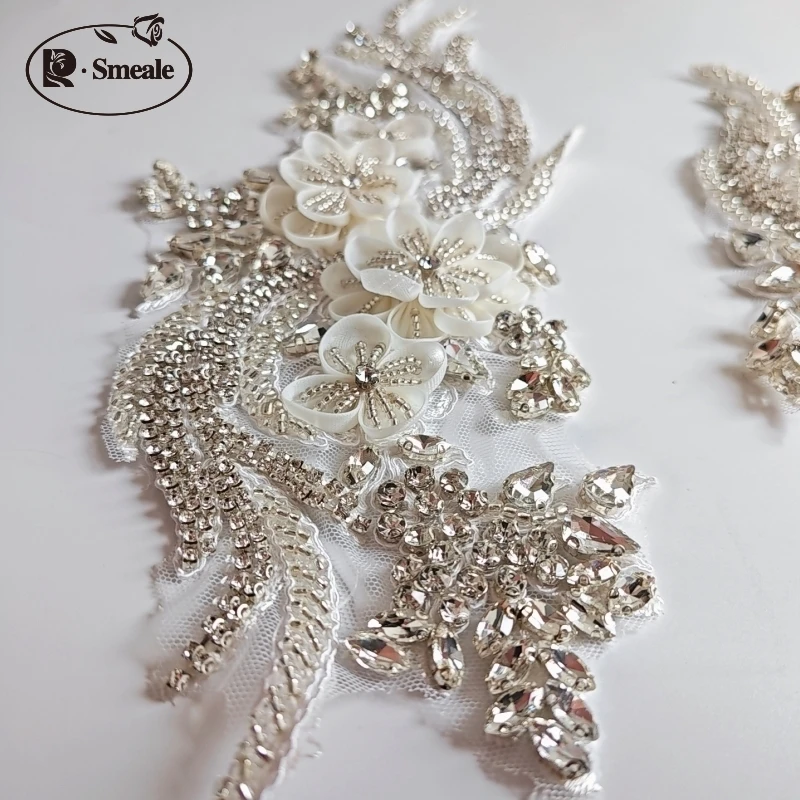 Appliques en strass pour robe de mariée, épaules, blanc, cousues à la main, perceuse en verre, fleurs miroir, scintillantes, patch DIY, 1Pai