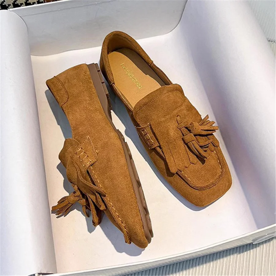 Ballerines à franges pour femmes, chaussures de marche et de conduite à bout carré, mocassins de vacances confortables avec pompons, Espadrilles plates