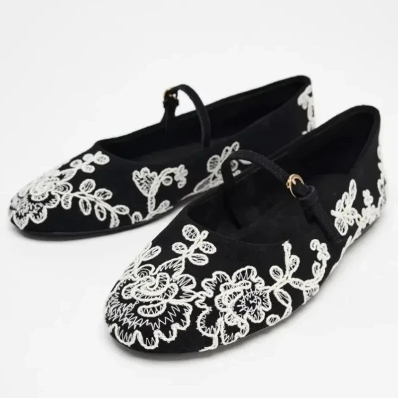 Ballerines de marque élégantes avec broderie de fleurs pour femmes, chaussures plates décontractées avec boucle à bande étroite, légères et confortables, Mary Jane