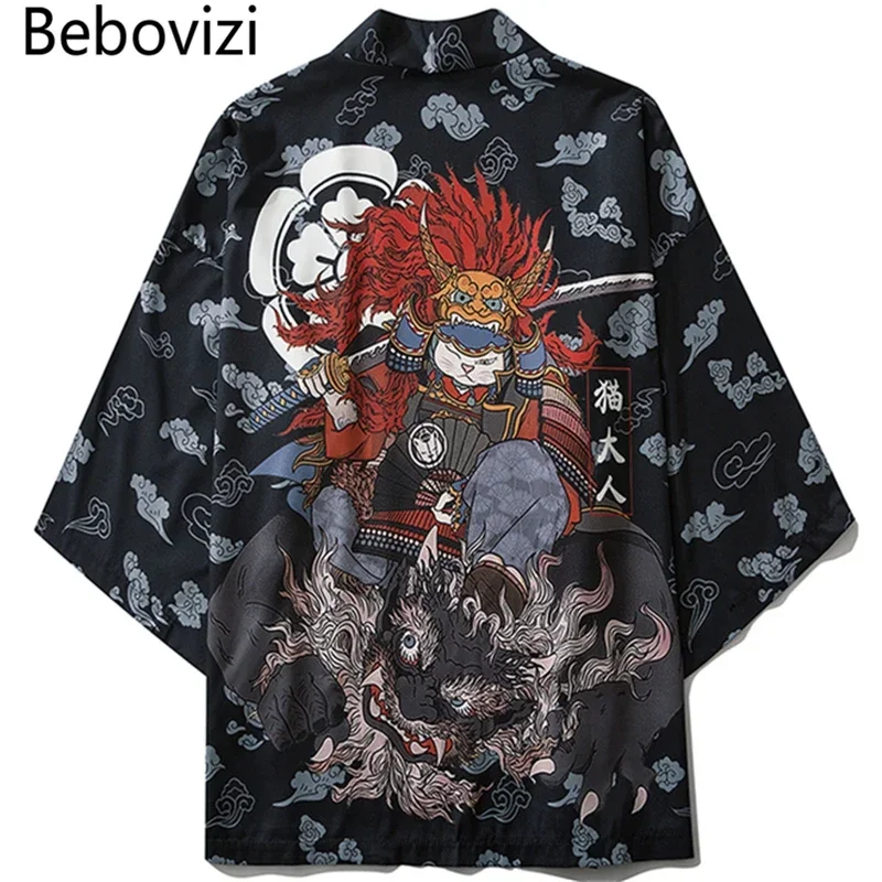 Bebovizi Style japonais chat samouraï Kimono Streetwear hommes femmes Cardigan japon Harajuku Anime Robe Anime vêtements 2023 été