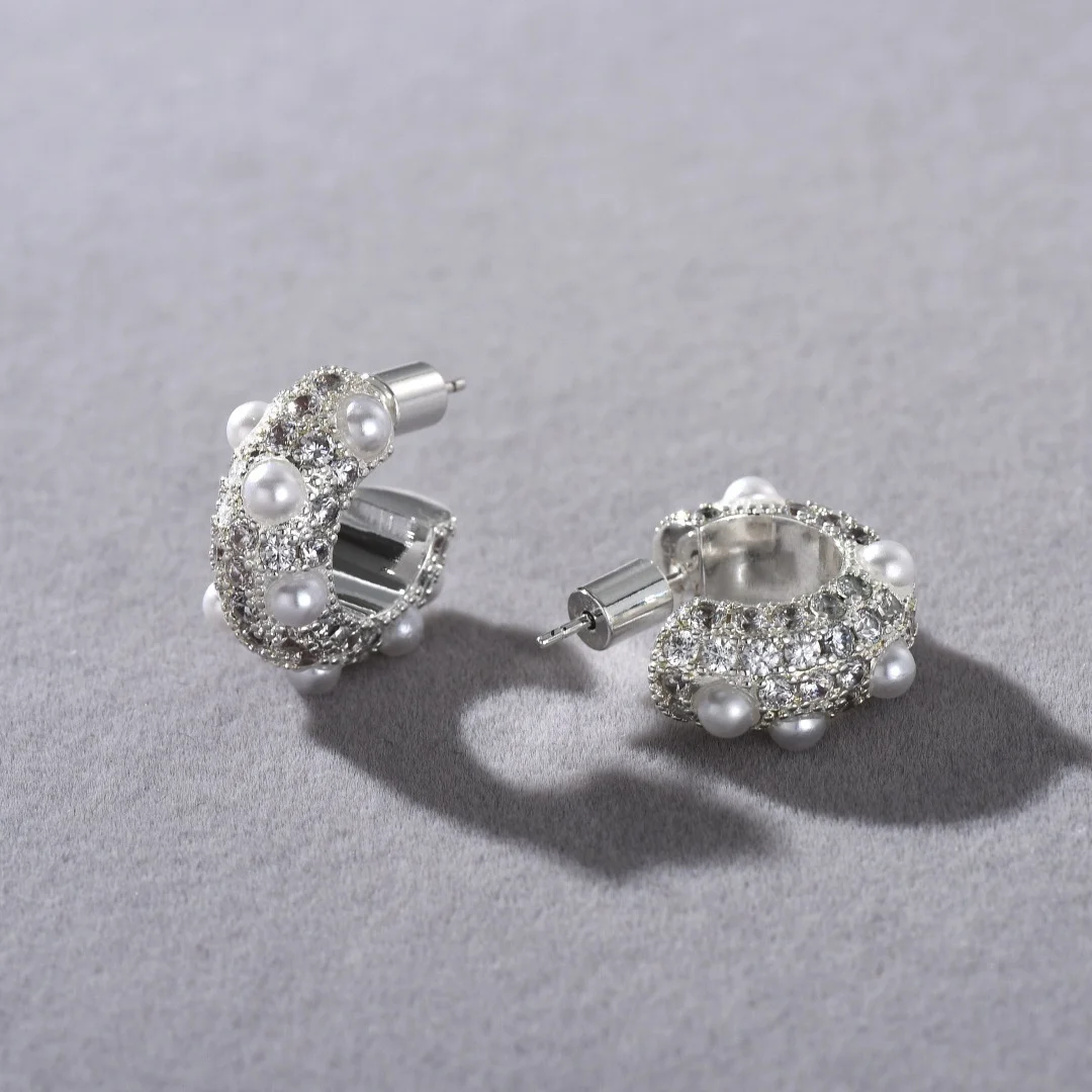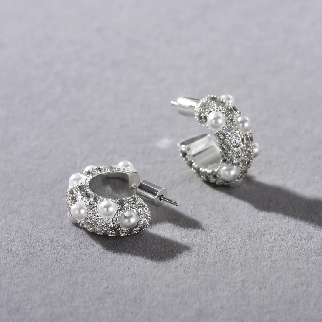 Boucle d'oreille élégante et indispensable, plaqué or blanc 18 carats, argent, perle et Zircon en forme de C, cerceau d'oreille/Huggies/clous, déclaration de Niche, bijoux Ins |