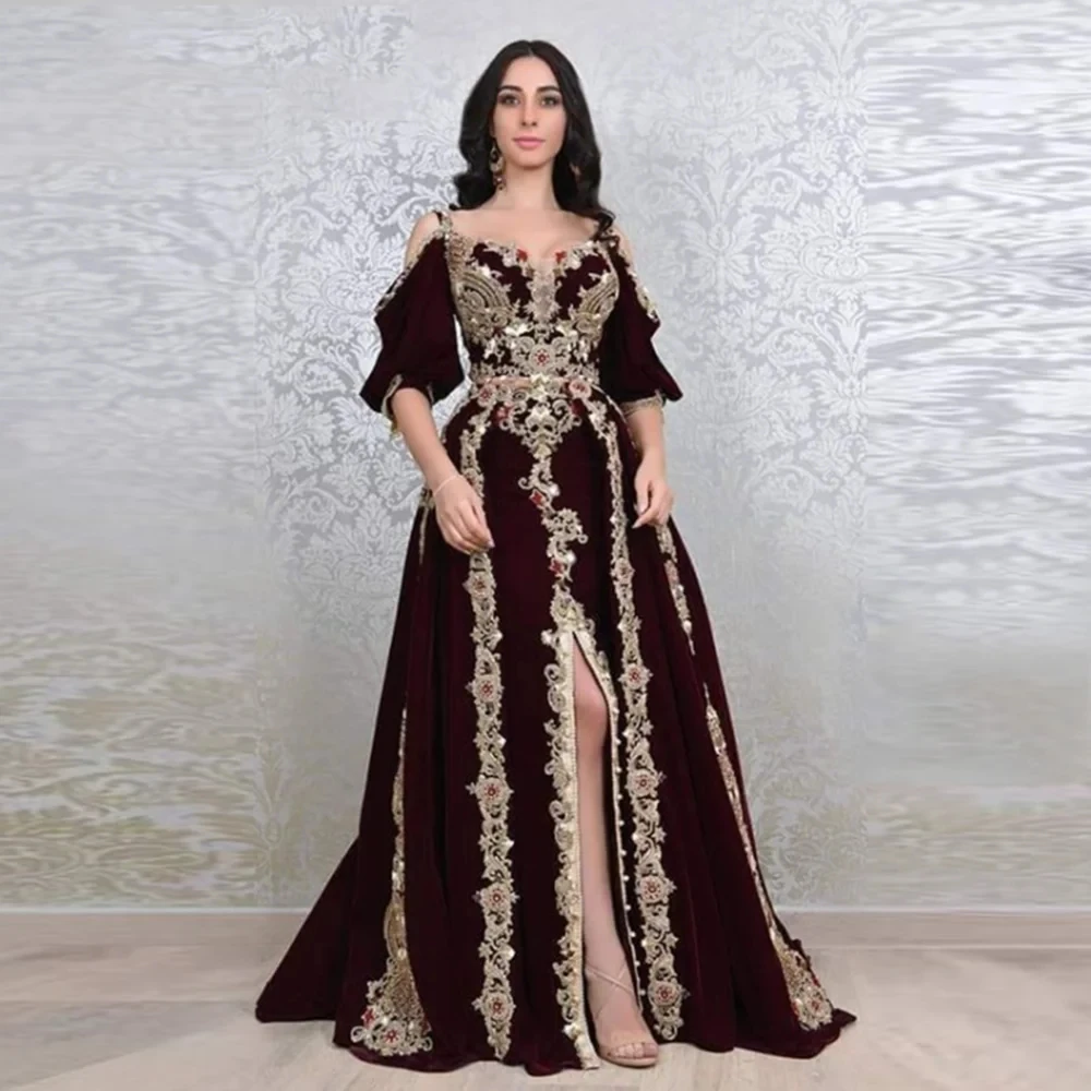 Caftan marocain bordeaux, robes de soirée formelles, ligne a, demi-manches, robes de bal appliquées, robes de soirée arabes personnalisées |