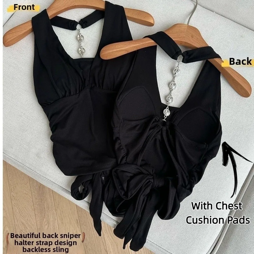 Camisole avec sangle de cou suspendue en strass, avec coussinets de poitrine, Slim Fit, haut court pour femmes, sensation haut de gamme, noir et blanc