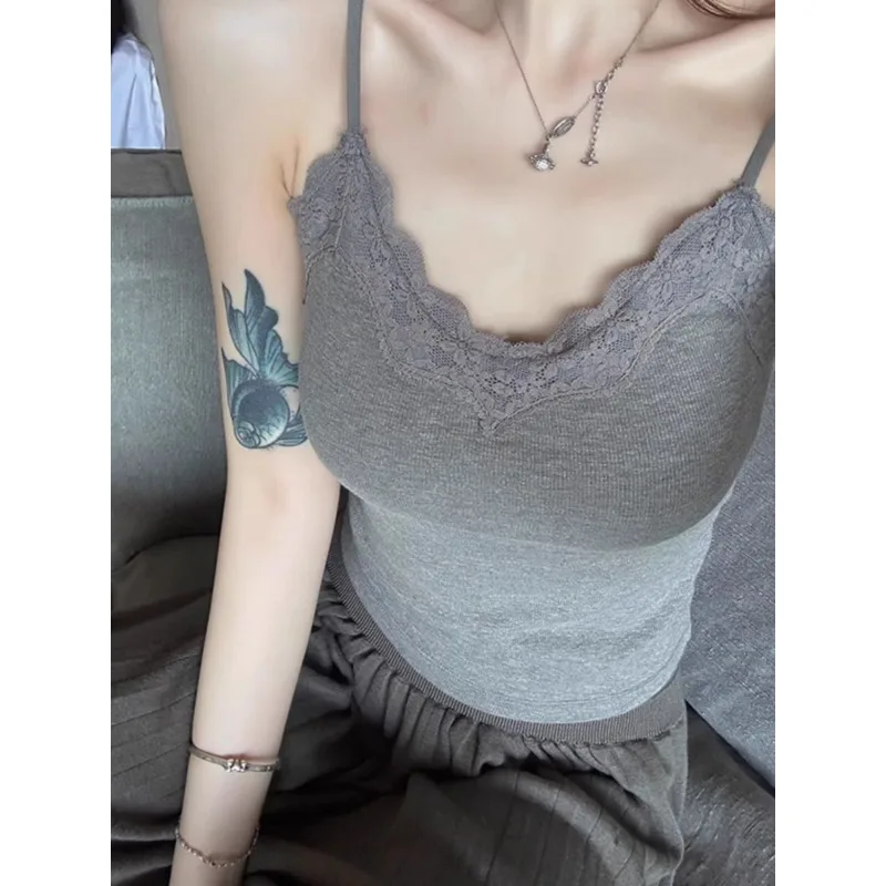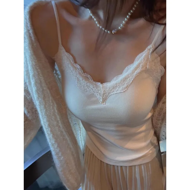 Camisole en dentelle à col en v pour femmes, nouvelle collection printemps-automne, bretelles de beauté, coussinet de poitrine avec fond, haut Slim sans manches