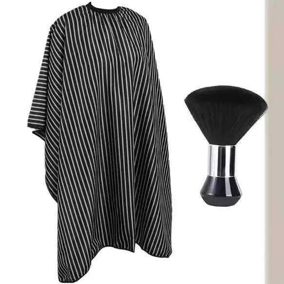 Cape de coiffure élégante à rayures noires avec brosse intégrée pour dépoussiérer le cou, utilisation en Salon à domicile |