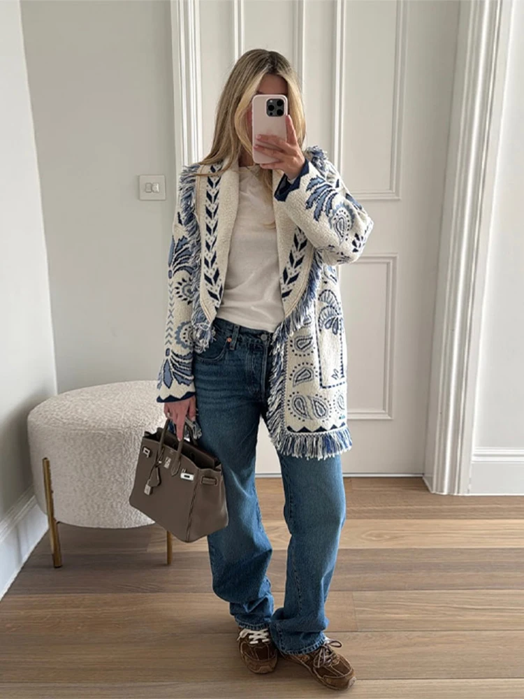 Cardigan imprimé Patchwork à franges pour femme, Jacquard, col rabattu, manches longues, ceinture, taille, pull tricoté, automne 2025
