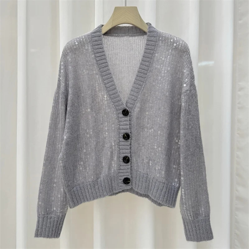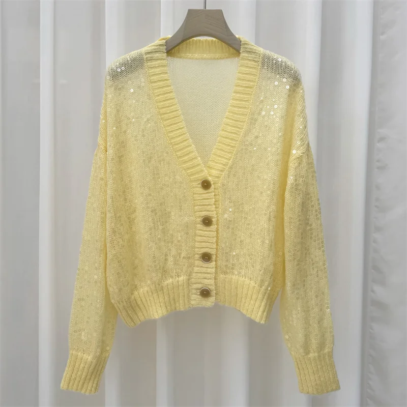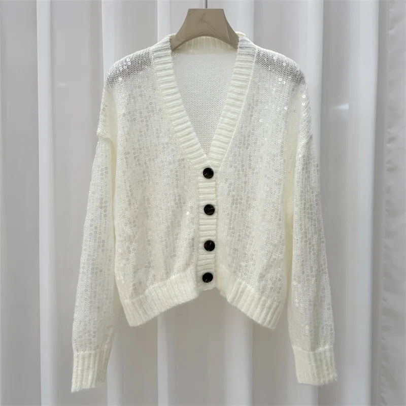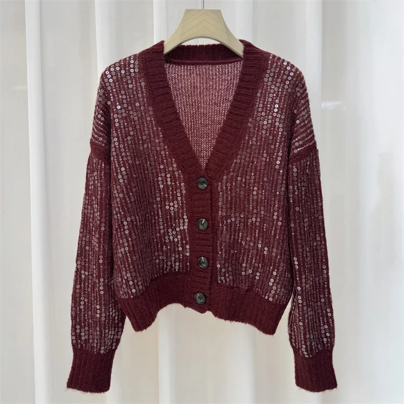 Cardigan pour femmes, tricoté élastique, col en v, haut à manches longues, décoration à paillettes, pull pour femme, manteau, nouvelle collection automne 2025 |