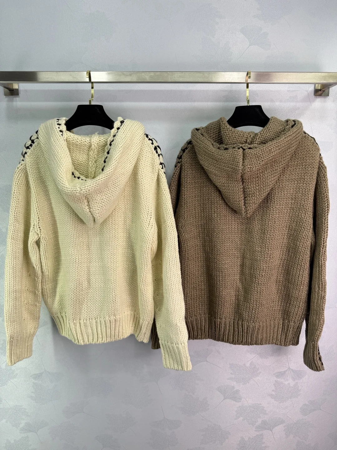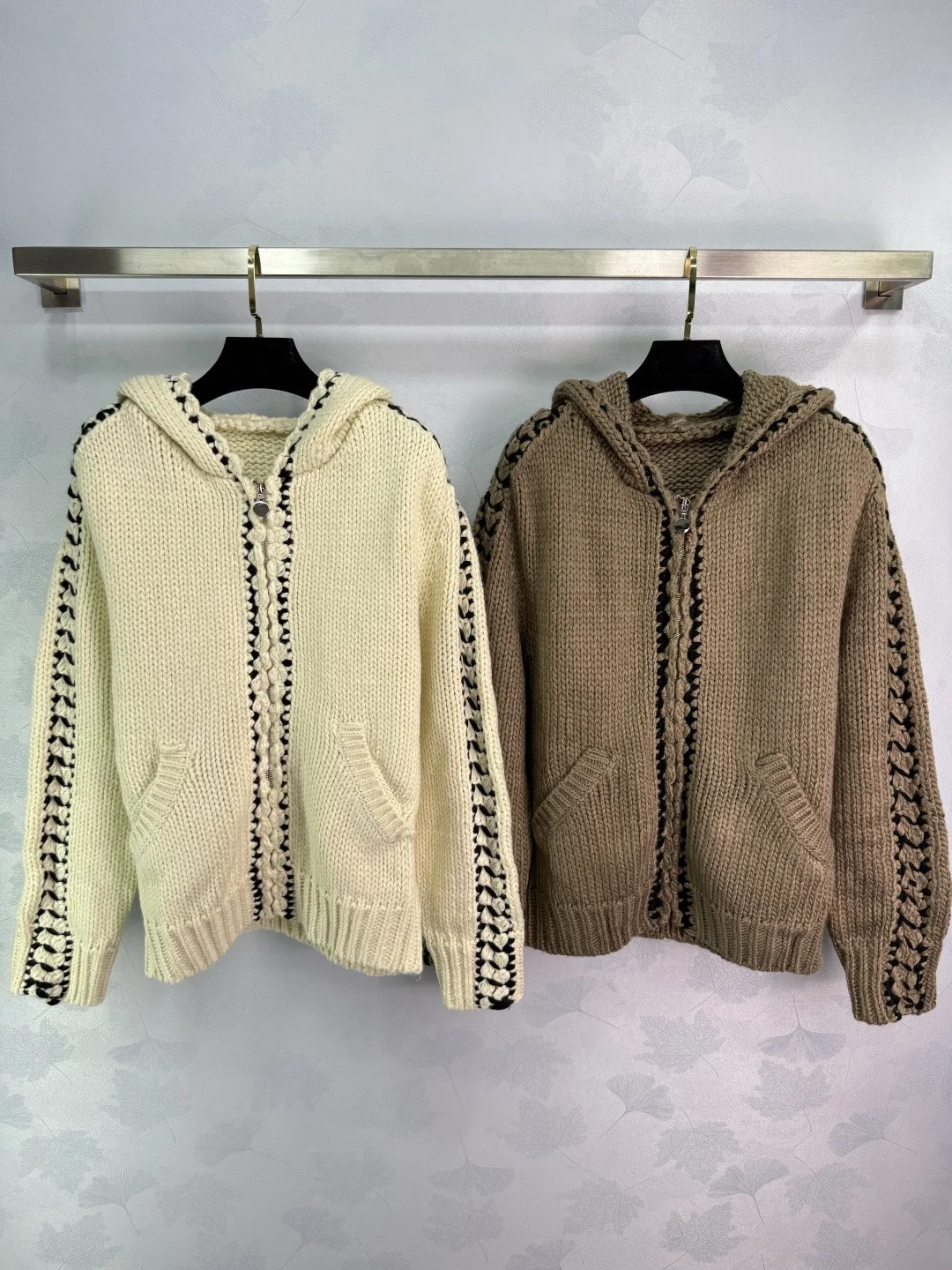 Ce nouveau cardigan décontracté en tricot à capuche comprend des détails crochetés à la main, des rayures décoratives tissées et une fermeture éclair.