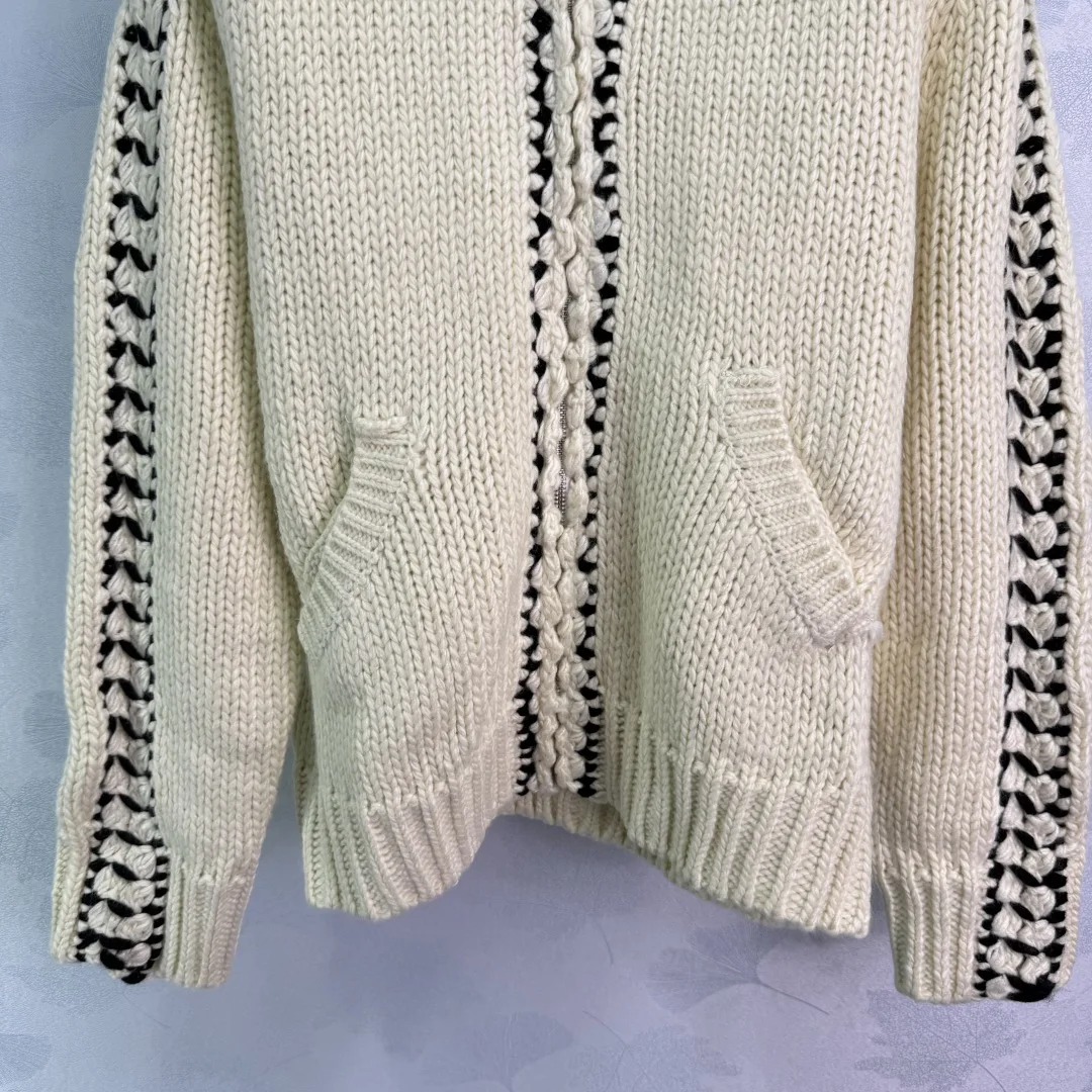"Ce cardigan en tricot est vraiment une belle pièce ! La matière est douce et confortable, et les détails crochetés et les rayures donnent un style décontracté très réussi. La fermeture éclair est pratique et robuste. Le seul petit bémol est que la capuche est un peu large pour ma tête, mais cela ne gâche en rien le plaisir de porter ce cardigan au quotidien. Dans l'ensemble, c'est un excellent achat, un vrai coup de cœur !"