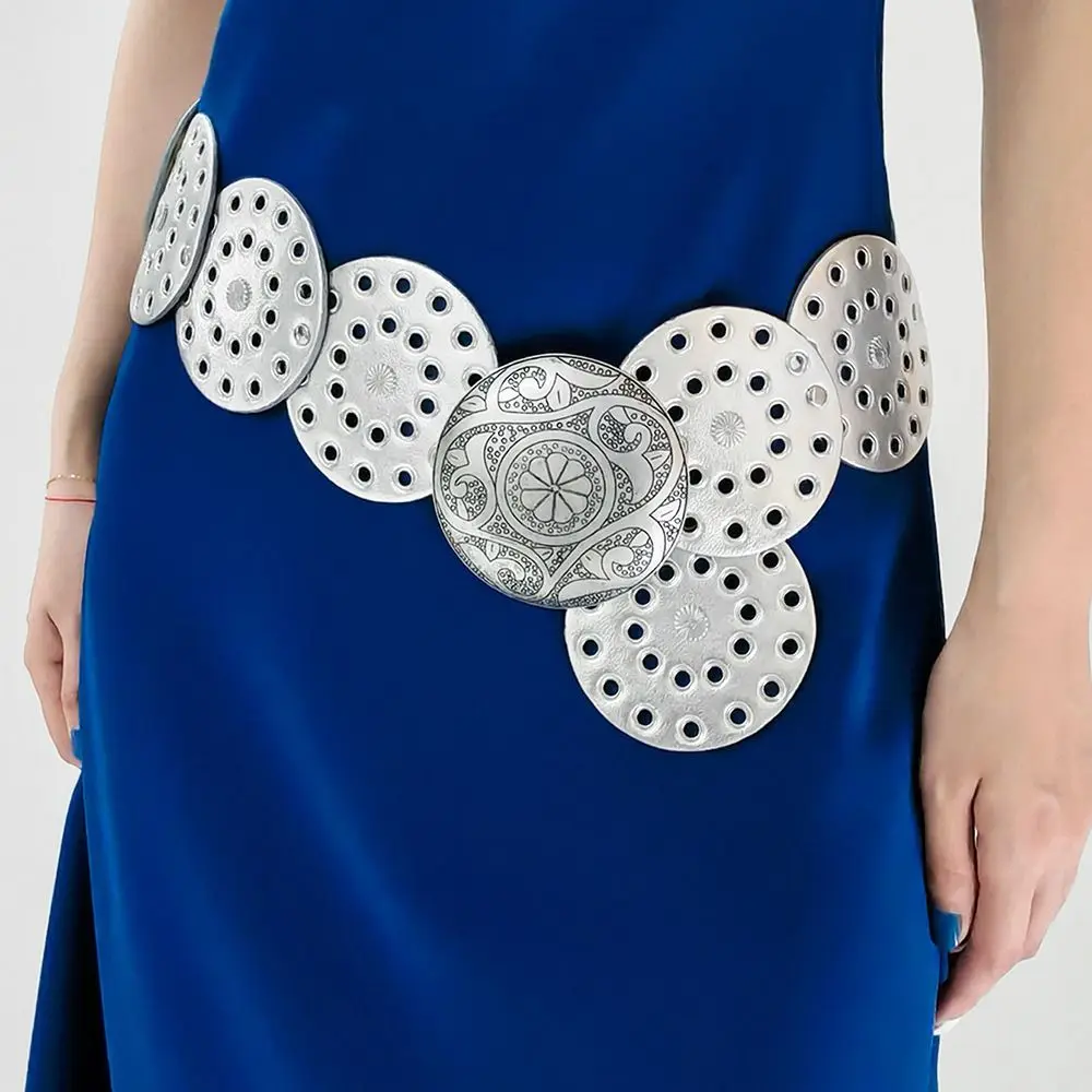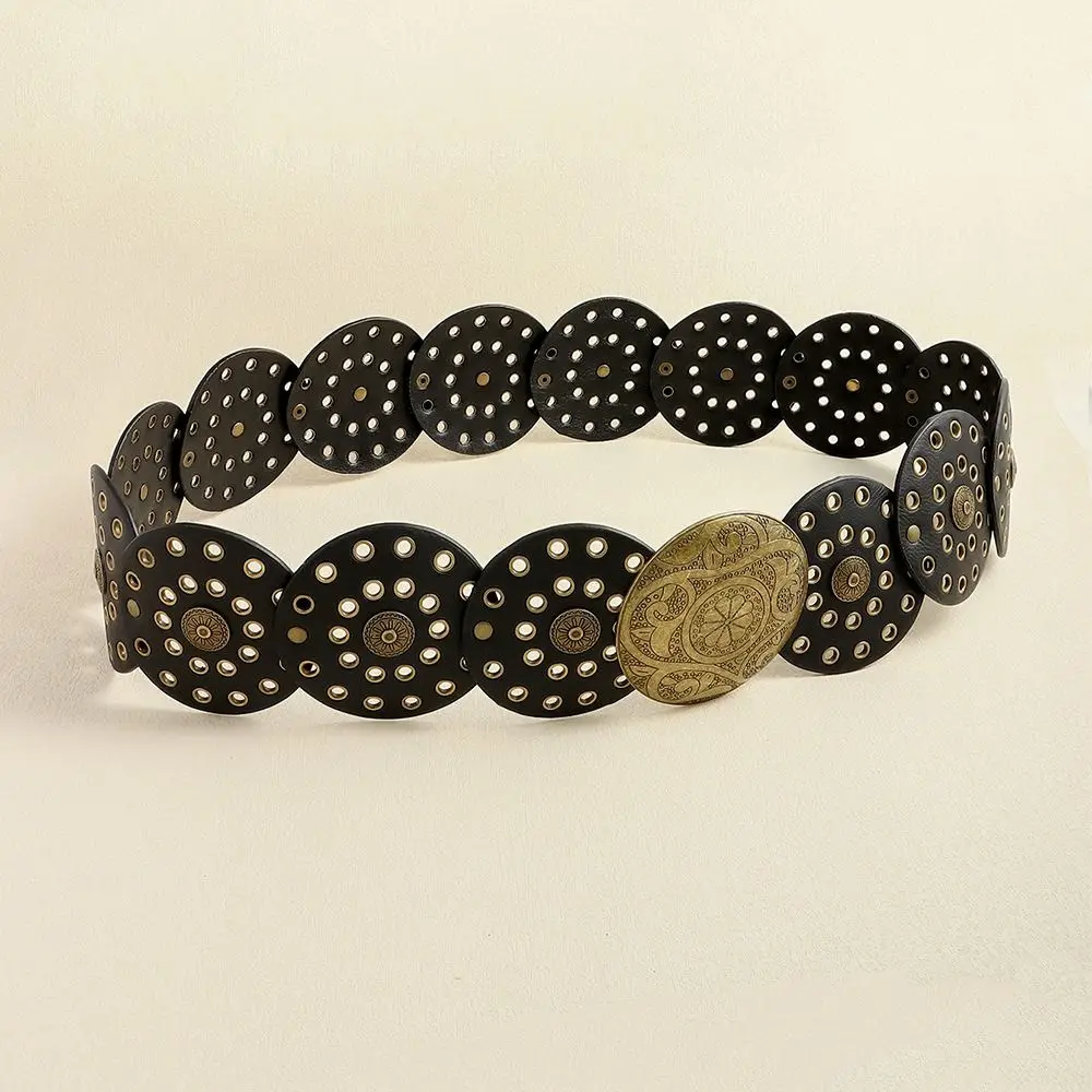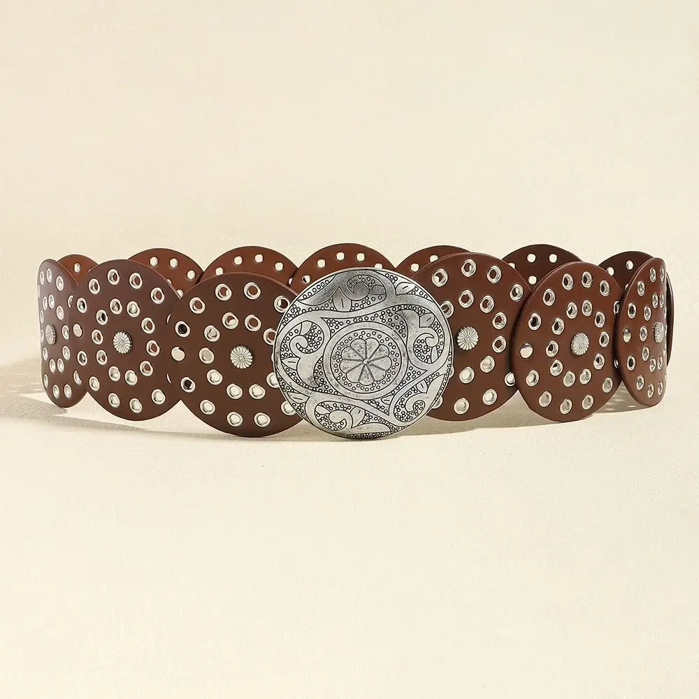 Ceinture Ajustable Vintage en PU pour Femme, Disque Large en Métal, Style Western Exagéré, Rond et Creux |