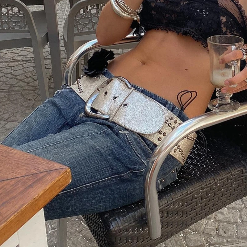 Ceinture Cowboy pour femmes, à rivets, large, gothique, boucle ardillon, pour pantalons en jean, accessoires féminins |