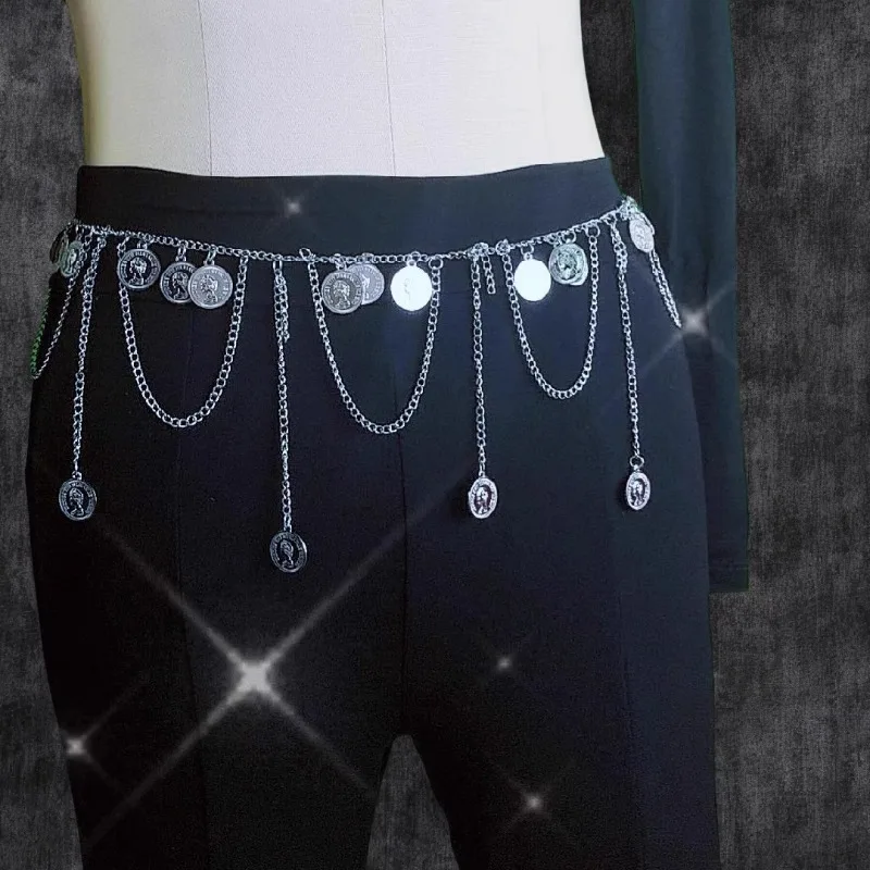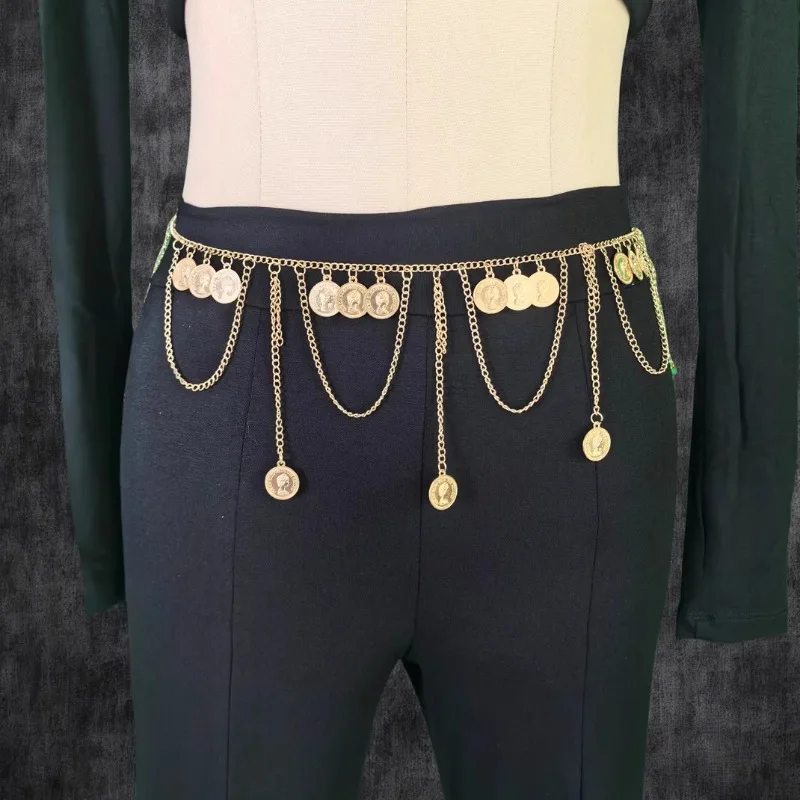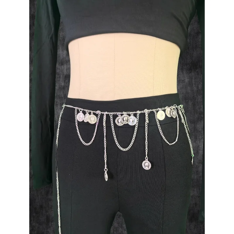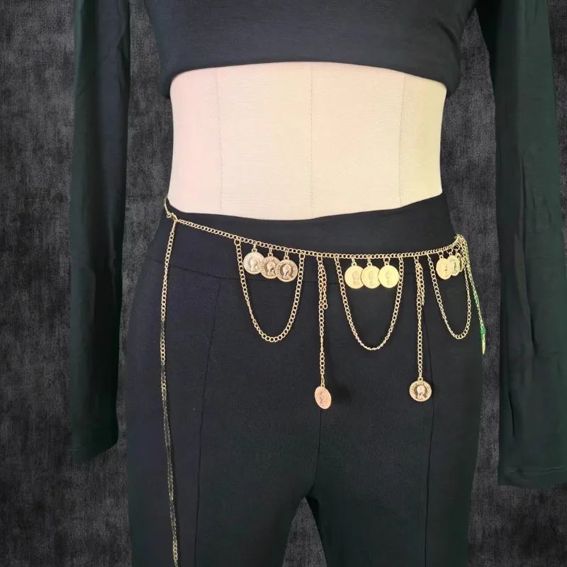Ceinture de danse du ventre personnalisée, chaîne de taille, petite chaîne en métal ondulé courbé, tête humaine, pièce de Gong en cuivre, chaîne de taille or argent |