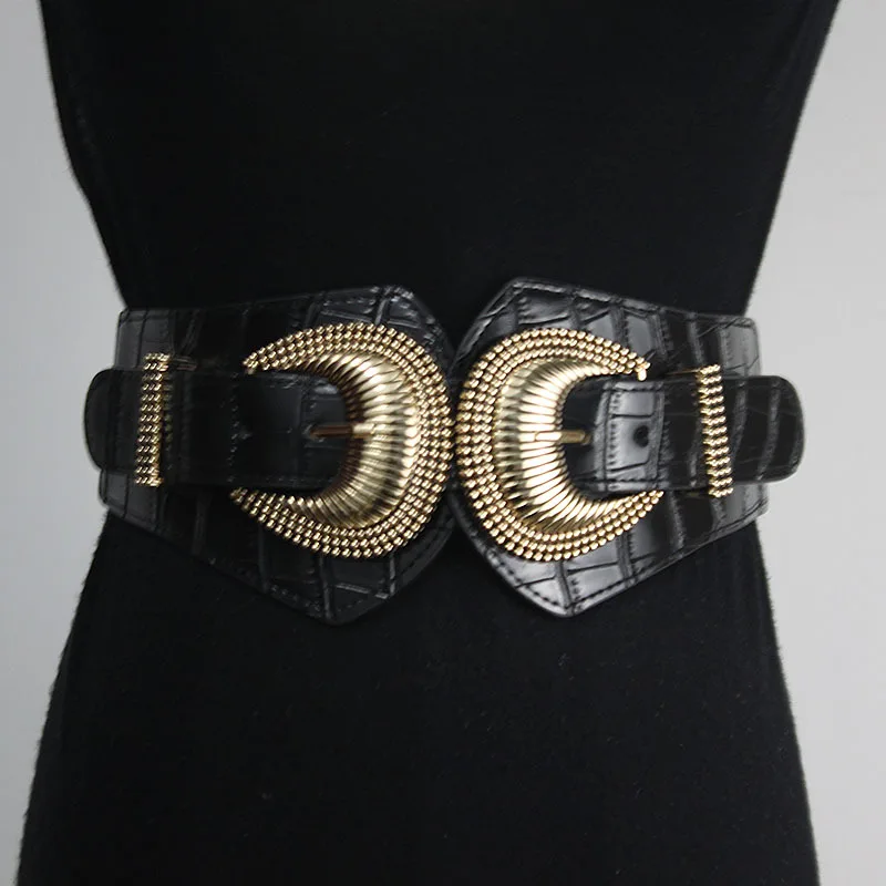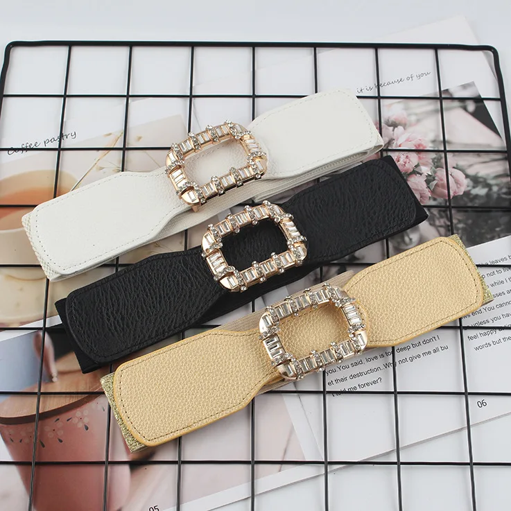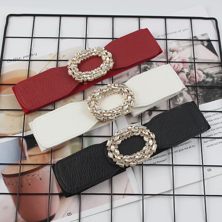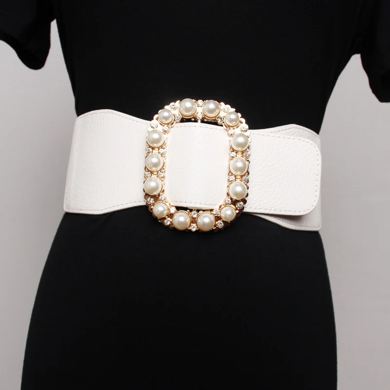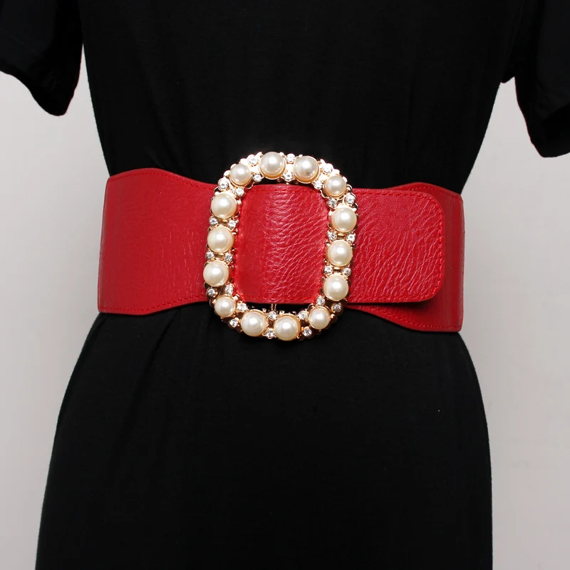 Ceinture large en cuir PU pour femmes, haute élasticité, extensible, pour robe, automne, extensible, blanc, rouge, boucle en perles |