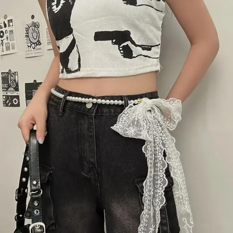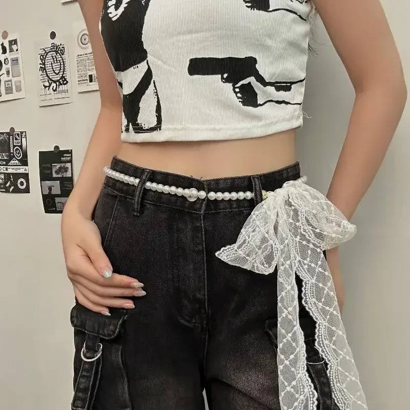 Ceinture longue en dentelle pour femmes, élégante, avec nœud, chaîne, pompon en perles, décoration, chaîne nouée, robe à nouer, ceinture en jean |