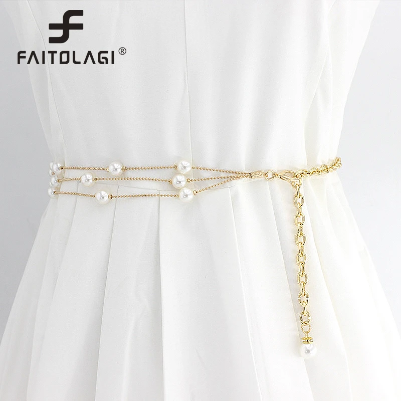 Ceinture longue et fine en perles multicouches pour femmes, élégante chaîne de corps en métal doré, décor de robe, bandes de taille réglables