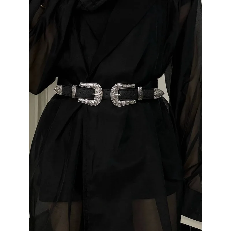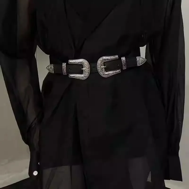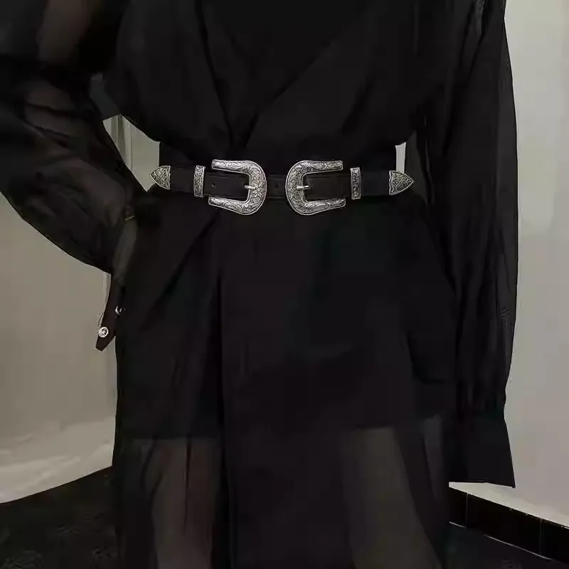 Ceinture noire pour femmes, nouvelle collection personnalisée avec 2 boucles ardillon rétro argentées, Design haut de gamme et tendance |