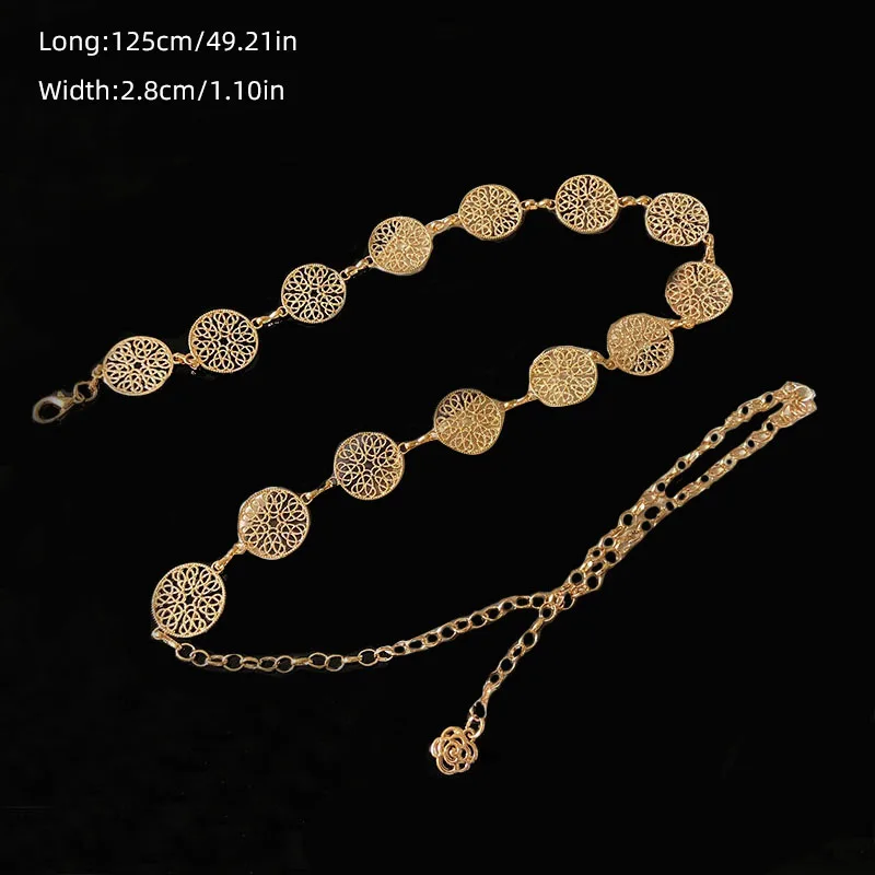 Ceinture ronde en métal pour femmes, élégante, rétro, or, argent, sculpté, chaîne ajourée, longues, robe à la mode, ceinture décorative pour damesCeinture ronde en métal pour femmes, élégante, rétro, or, argent, sculpté, chaîne ajourée, longues, robe à la mode, ceinture décorative pour dames