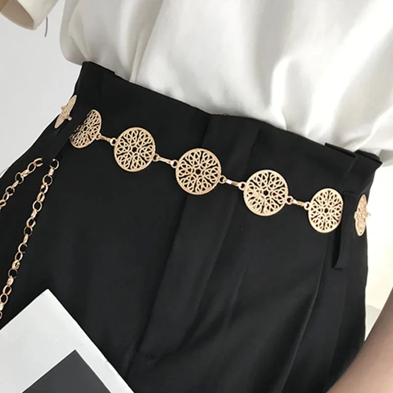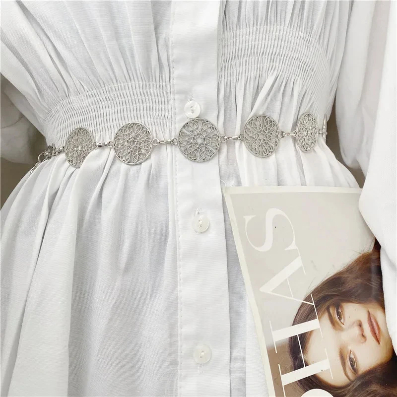 Ceinture ronde en métal pour femmes, élégante, rétro, or, argent, sculpté, chaîne ajourée, longues, robe à la mode, ceinture décorative pour dames |