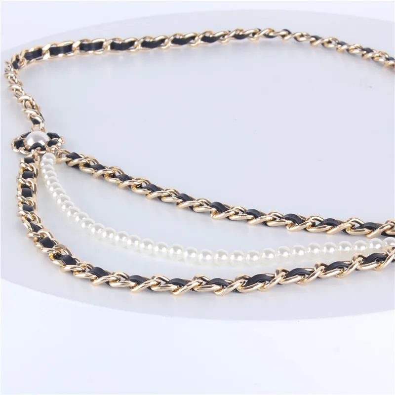 Ceintures en chaîne de perles pour femmes, en cuir, de luxe, en métal, multicouches, à fleurs, pour robe, chaîne de taille pour dames