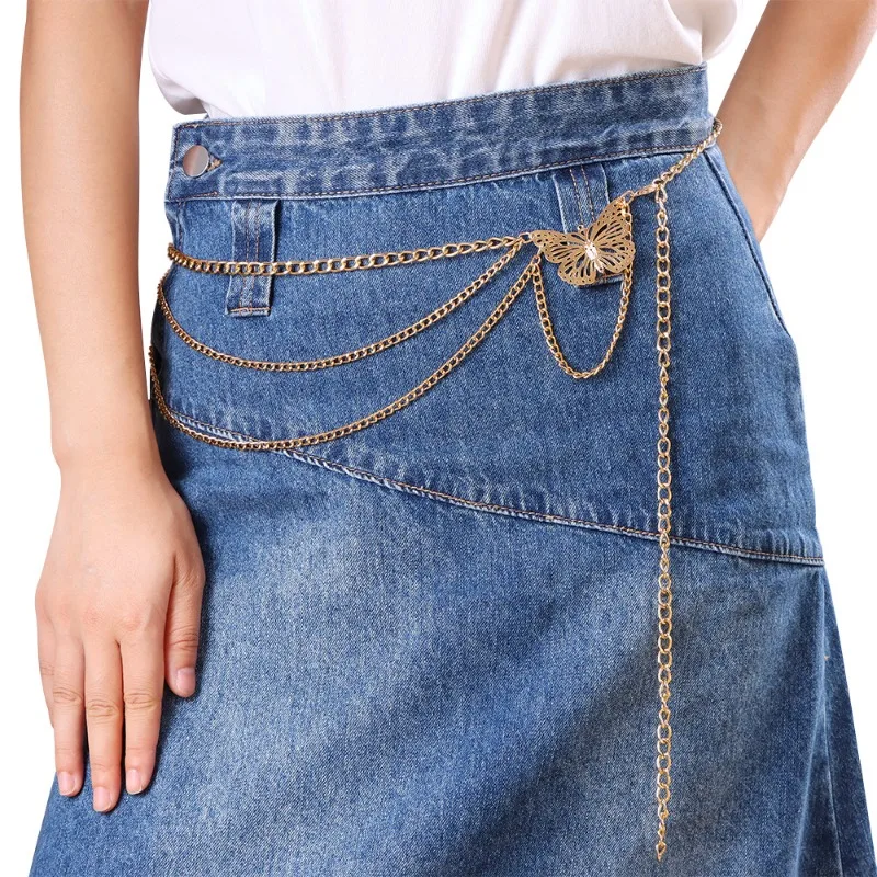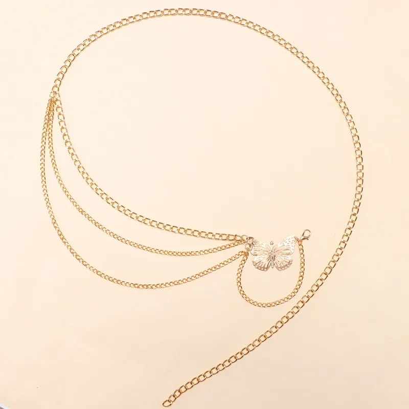 Chaîne de taille papillon élégante pour femmes, métal doré, vent multicouche, ceinture à franges, robe de scène, accessoire de mode, chaîne de pantalon