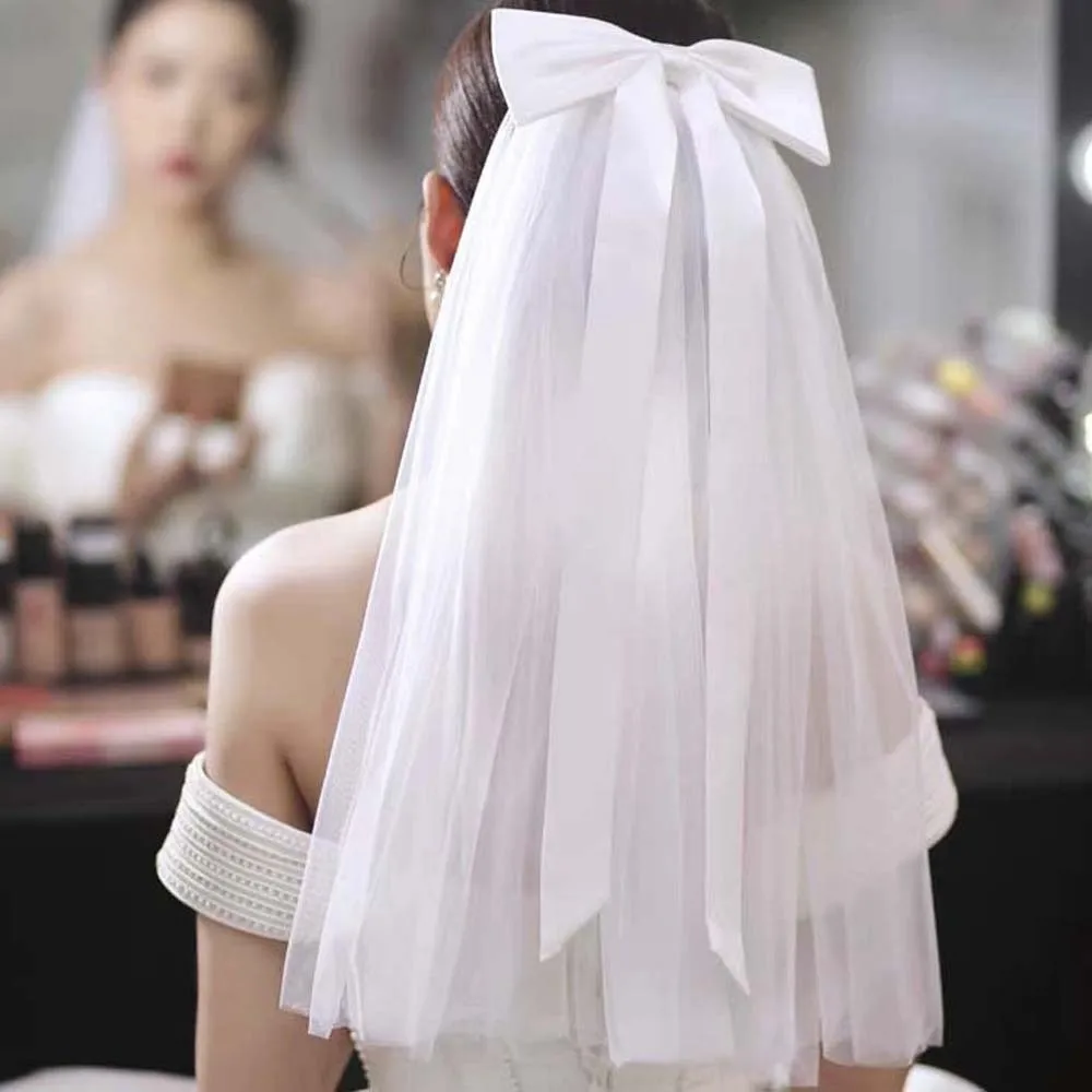 Châle Long en Satin avec nœud Premium, voile monocouche, couvre-chef blanc romantique pour mariée, fait à la main, doux, coiffure de mariée, église