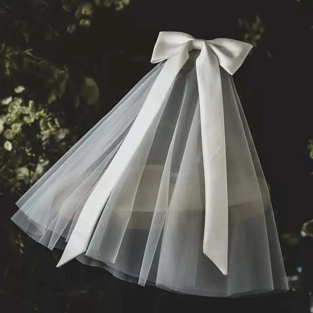 Châle Long en Satin avec nœud Premium, voile monocouche, couvre-chef de mariée romantique blanc, Tulle doux, coiffure de mariée douce pour mariage