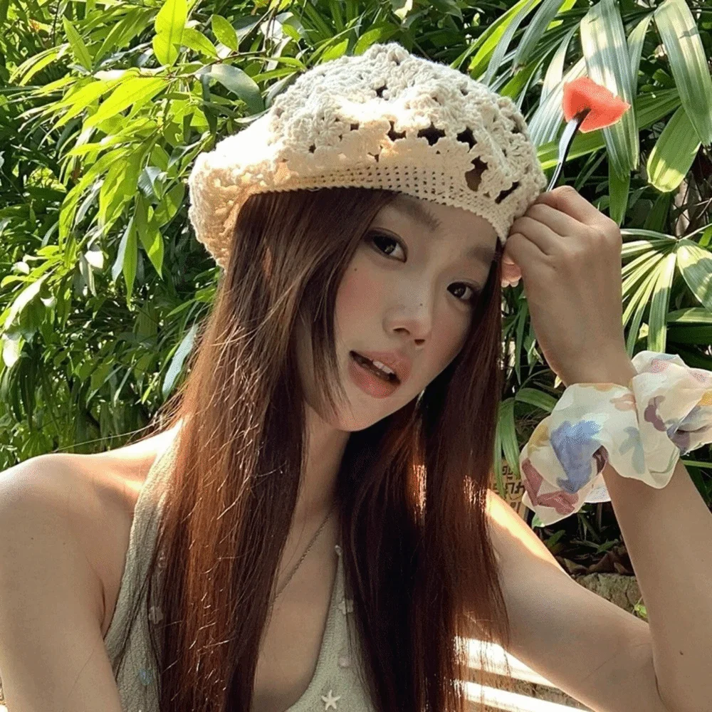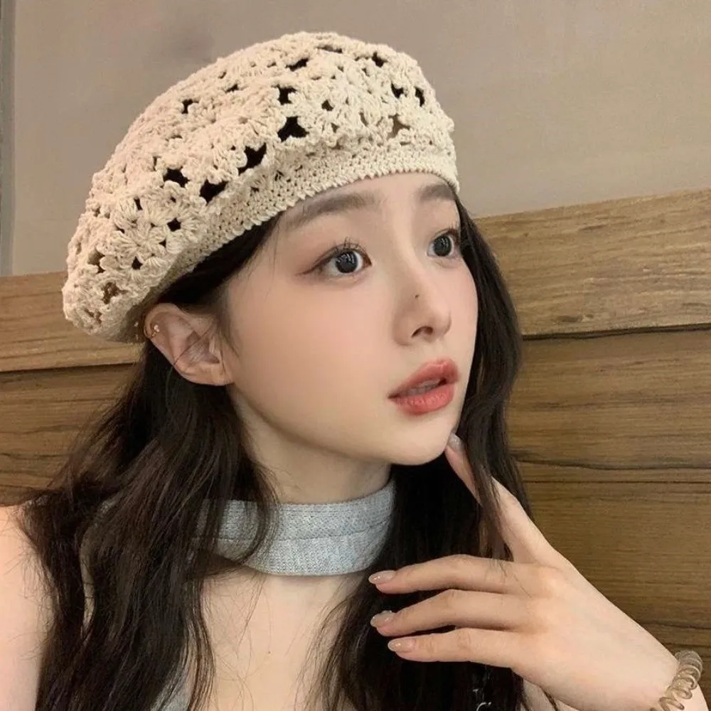 Chapeau à fleurs respirant, grande circonférence de la tête, béret ajouré, couvre-chef, Style japonais, bonnet tricoté au Crochet, vacances