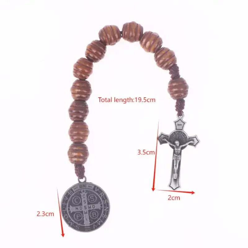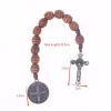 Chapelet de poche catholique pratique avec perles en bois marron, médaille Saint benoît et crucifix. |