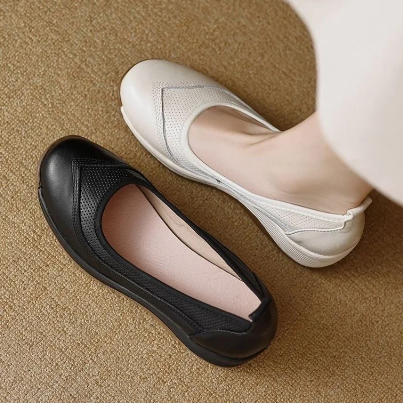 Chaussures plates compensées confortables en cuir souple blanc pour femmes – Respirantes et polyvalentes |