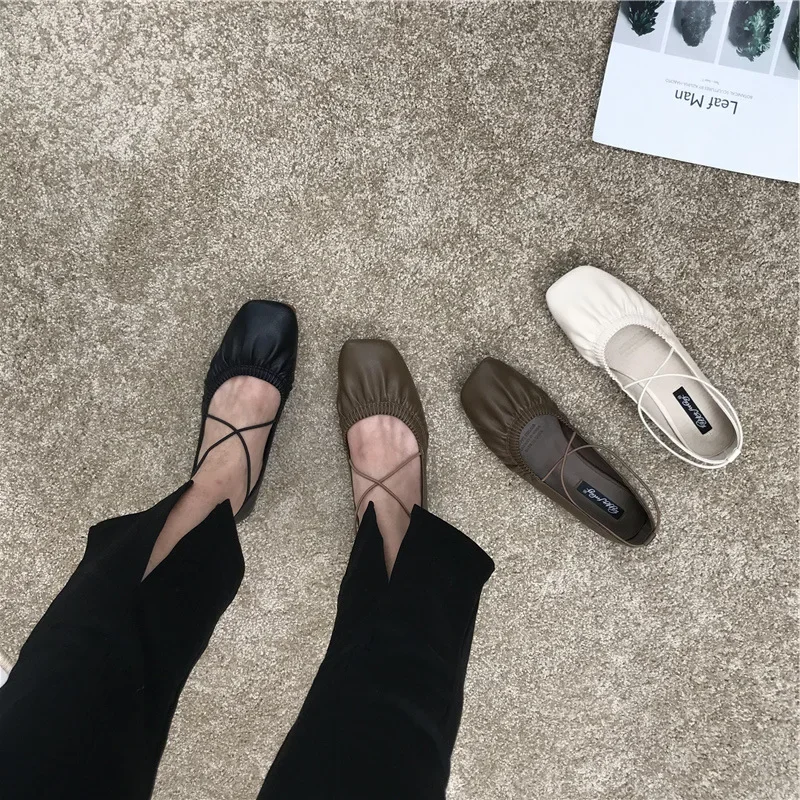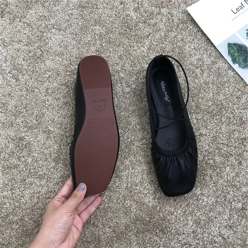 Chaussures simples plissées pour femmes, bout carré, ballerines en cuir souple, couleur unie, chaussures de danse élégantes, mocassins à ceinture croisée pour dames |