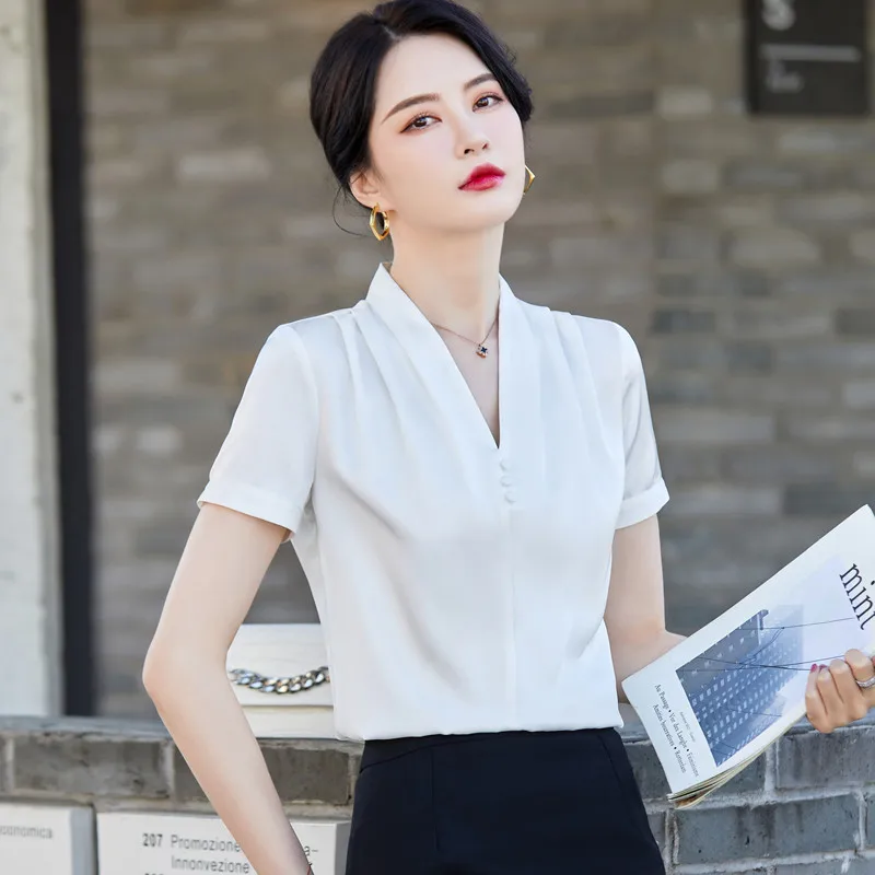 Chemise en Satin à col en V pour femmes, chemisiers Slim à manches courtes, Design de tempérament, nouvelle mode, bureau, hauts de travail formels pour dames, 2022 |