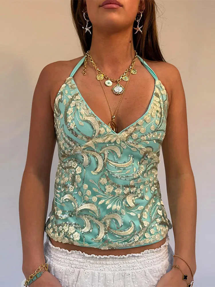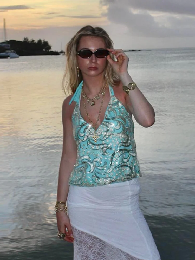 Chemise perlée à paillettes pour femmes, style Boho, plage, vacances, haut court, paillettes scintillantes, dos nu, col licou, Y2k, Coquette Camis