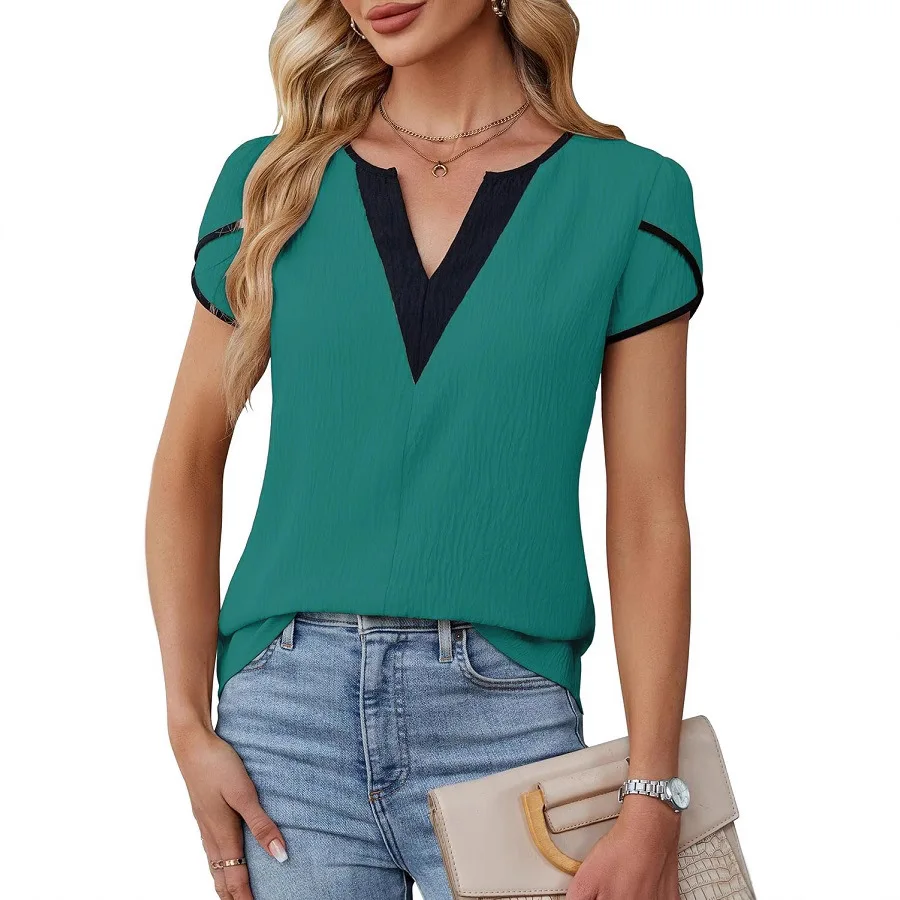 Chemises amples et décontractées à manches courtes et col en v pour femmes, chemisier d’été à la mode, couleur contrastée, chemise de bureau élégante pour dames, hauts à manches pétales