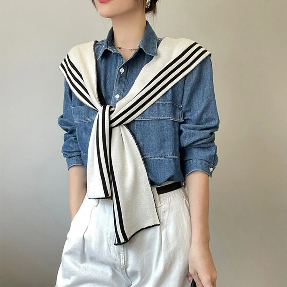 Chemisier Simple épaules faux col tricoté châle crème solaire Cape noir blanc rayure écharpe Style coréen Cape laine foulards femmes |