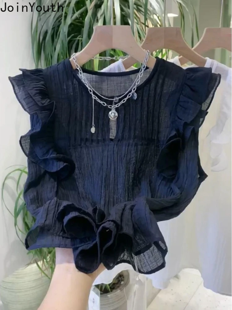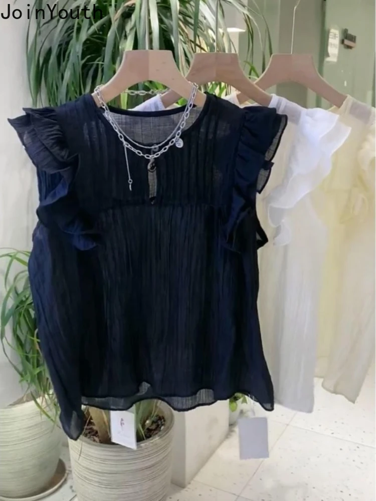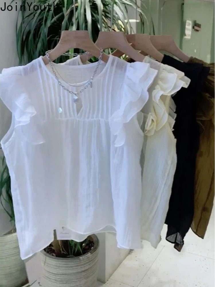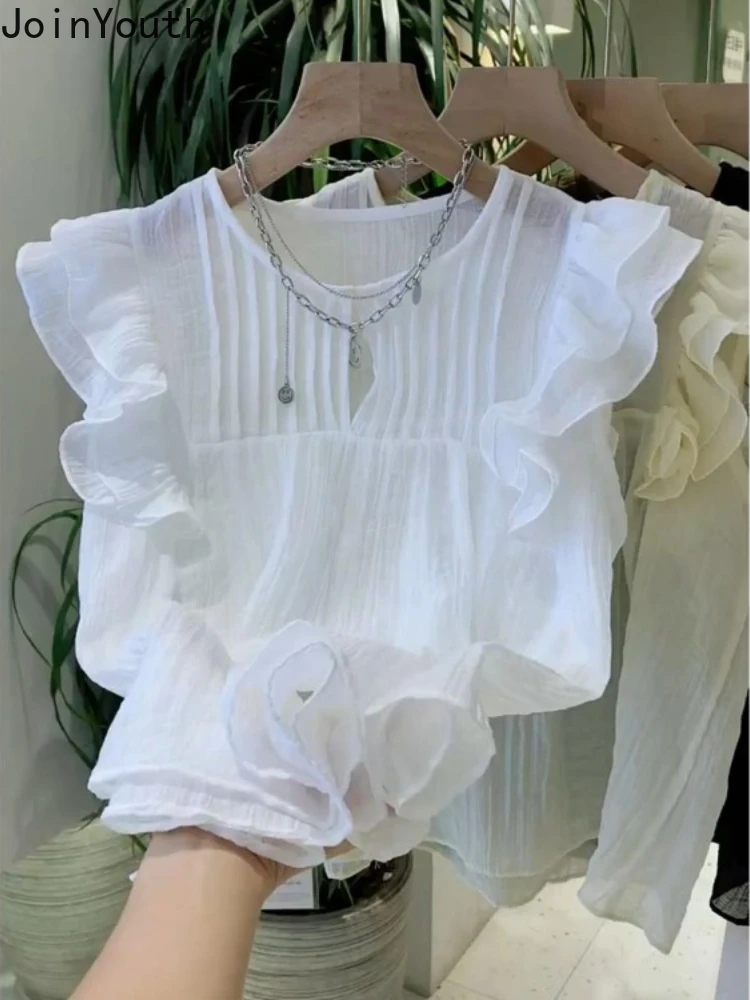 Chemisiers blancs à col rond pour femmes, chemises à volants, chemisier d'été vintage, mode 2025 |